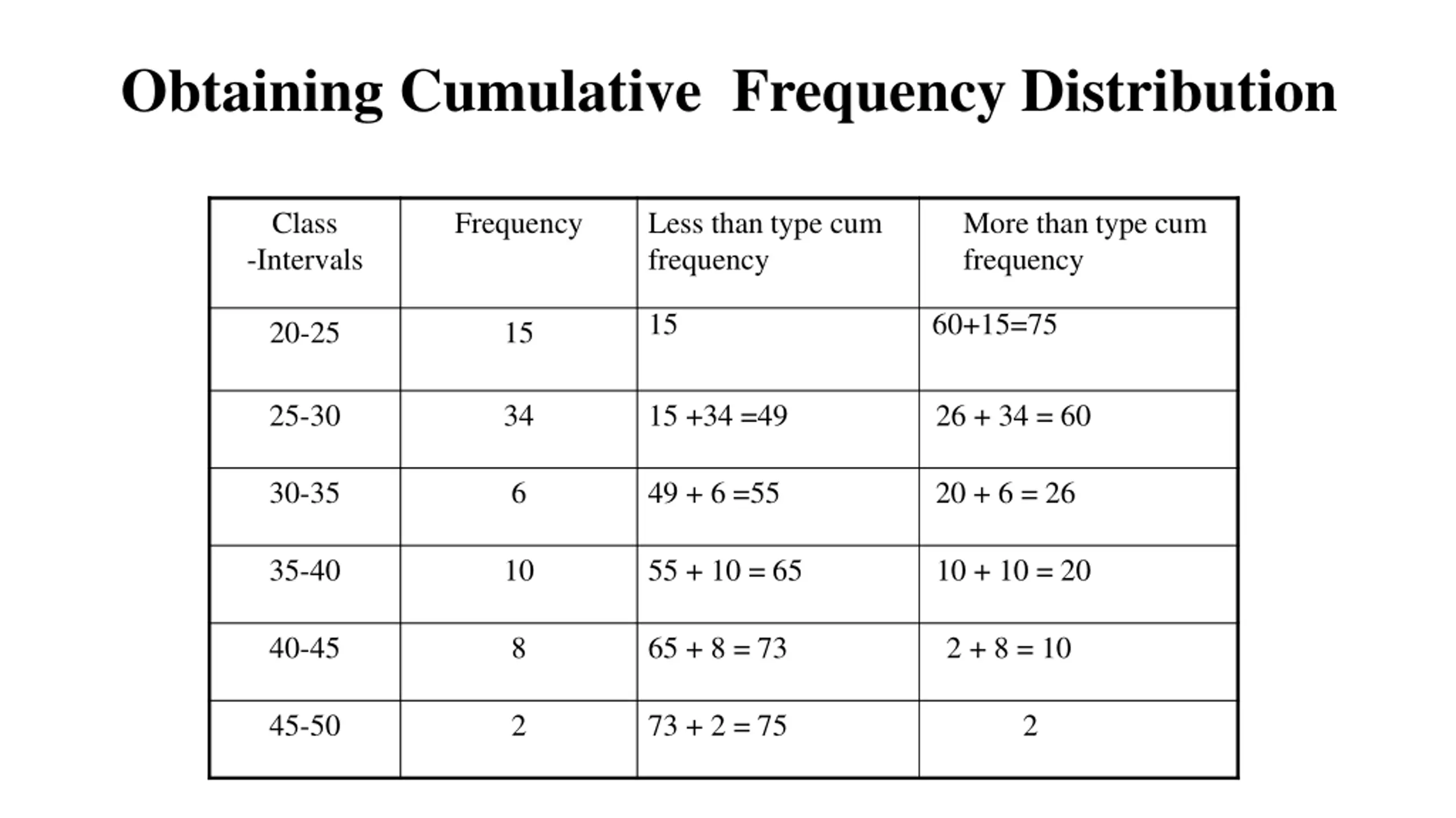 Obtaining Cumulative Frequency Distribution Class -Intervals Frequency Less than type cum frequency More than type cum frequency 15 60+15=75 20-25 15 25-30 34 15 +34 =49 26 + 34 = 60 30-35 6 49 + 6 =55 20 + 6 = 26 35-40 10 55 + 10 = 65 10 + 10 = 20 40-45 8 65 + 8 = 73 2 + 8 = 10 45-50 2 73 + 2 = 75 2