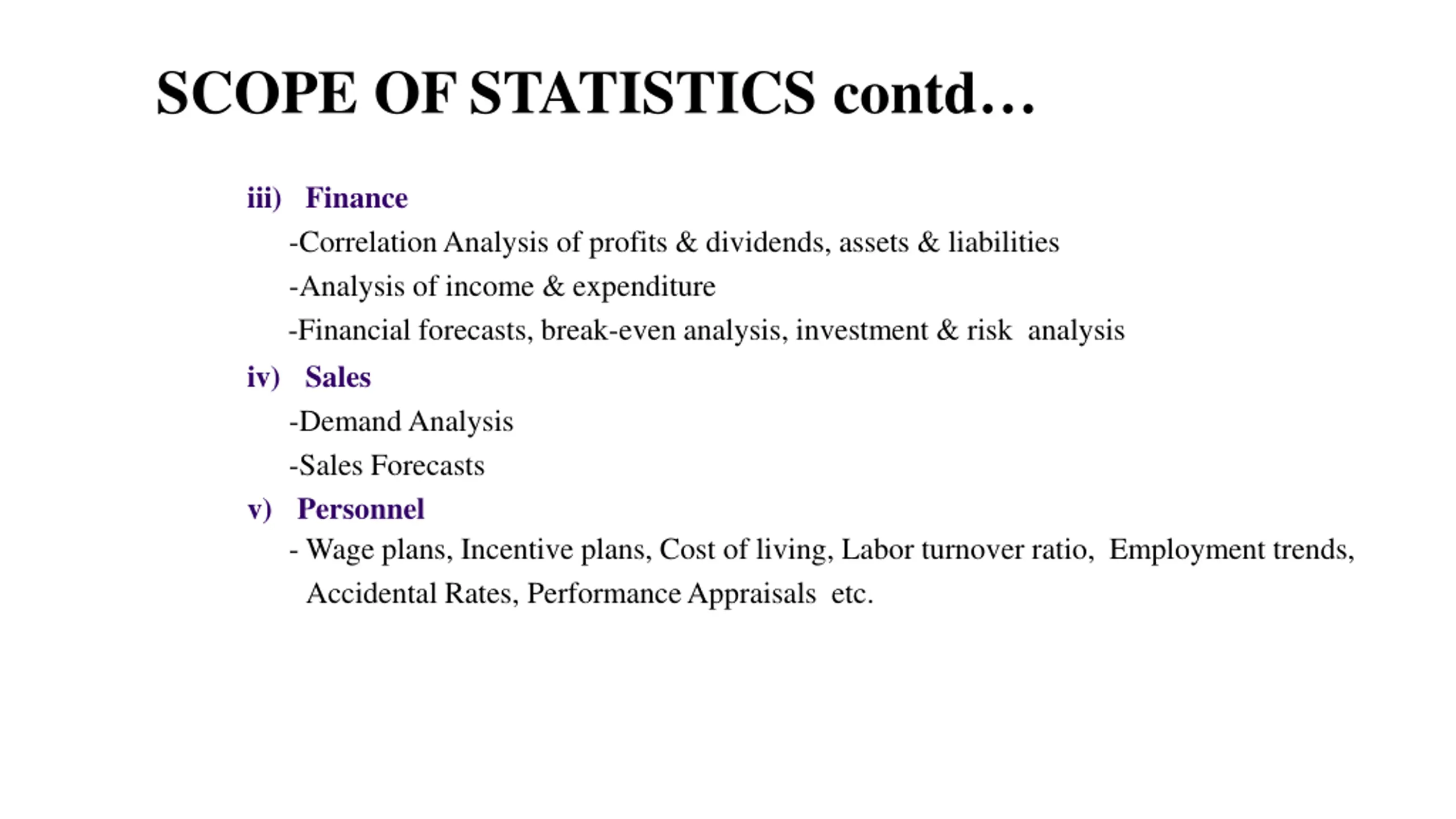 SCOPE OFSTATISTICS contd iii) Finance -Correlation Analysis of profits & dividends, assets & liabilities -Analysis of income & expenditure -Financial forecasts, break-even analysis, investment & risk analysis iv) Sales -DemandAnalysis -Sales Forecasts v) Personnel - Wage plans, Incentive plans, Cost of living, Labor turnover ratio, Employment trends, Accidental Rates, Performance Appraisals etc.