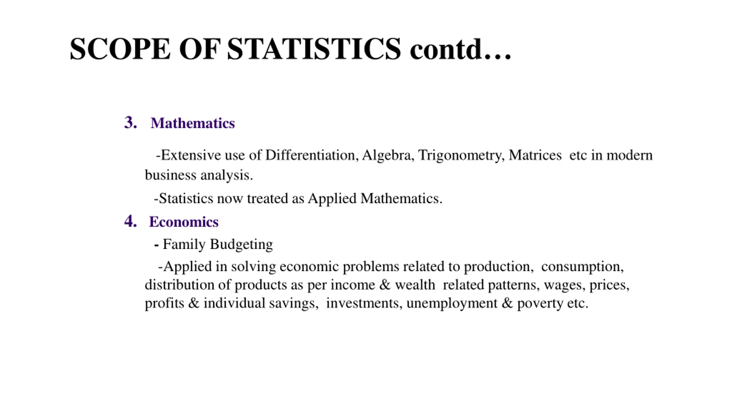 SCOPE OFSTATISTICS contd 3. Mathematics -Extensive use of Differentiation, Algebra, Trigonometry, Matrices etc in modern business analysis. -Statistics now treated as Applied Mathematics. 4. Economics - Family Budgeting -Applied in solving economic problems related to production, consumption, distribution of products as per income & wealth related patterns, wages, prices, profits & individual savings, investments, unemployment & poverty etc.