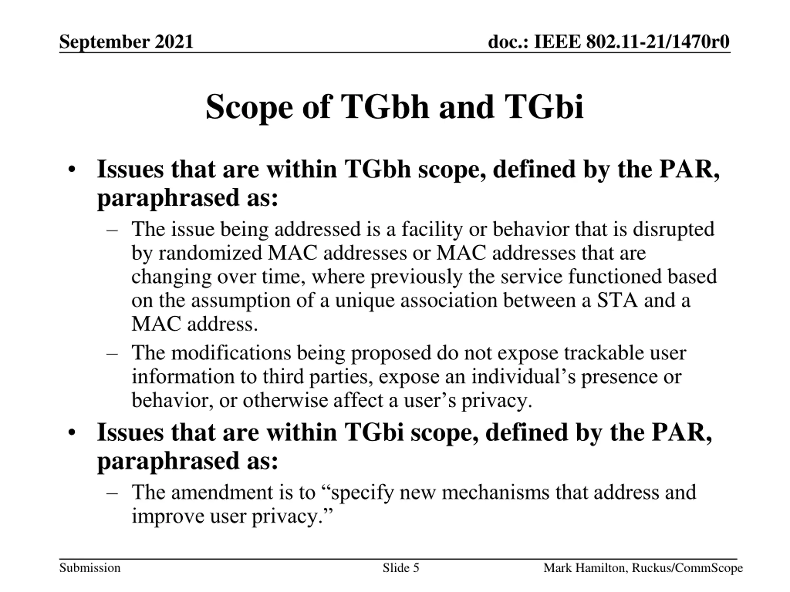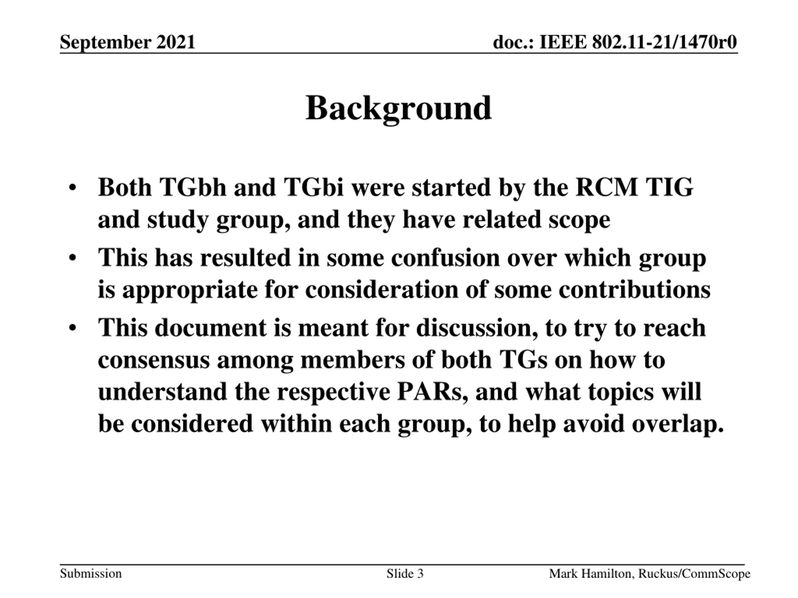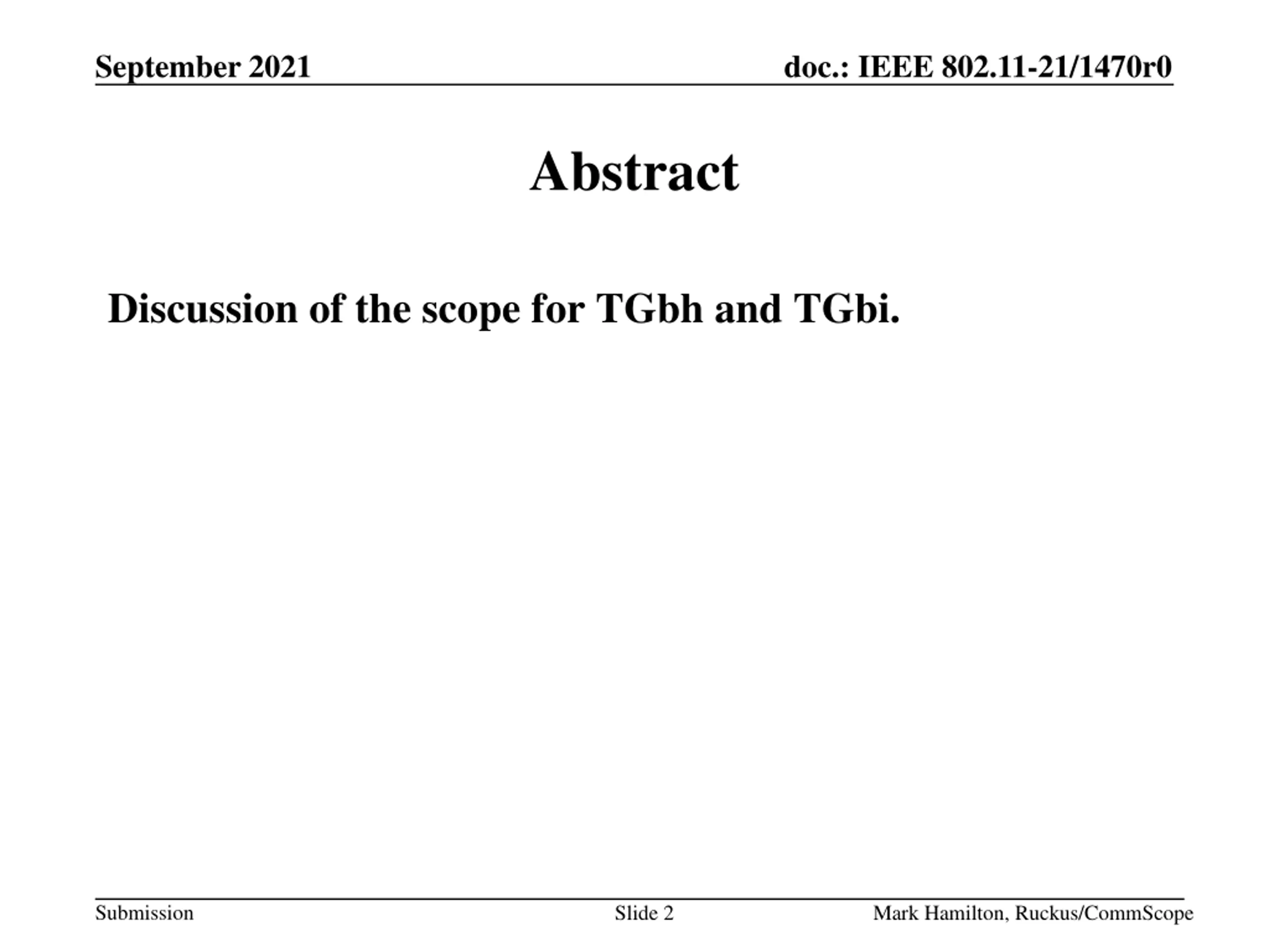 September 2021 doc.: IEEE 802.11-21/1470r0 Abstract Discussion of the scope for TGbh and TGbi. Submission Slide 2 Mark Hamilton, Ruckus/CommScope