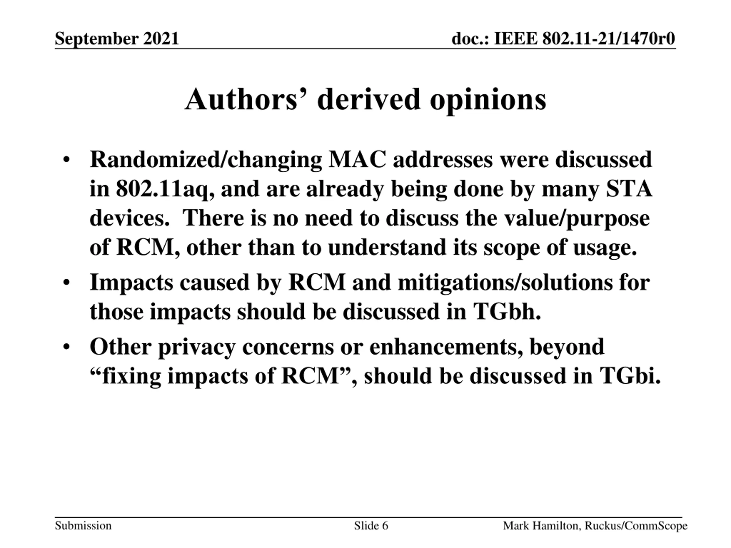 September 2021 doc.: IEEE 802.11-21/1470r0 Authors derived opinions Randomized/changing MAC addresses were discussed in 802.11aq, and are already being done by many STA devices. There is no need to discuss the value/purpose of RCM, other than to understand its scope of usage. Impacts caused by RCM and mitigations/solutions for those impacts should be discussed in TGbh. Other privacy concerns or enhancements, beyond fixing impacts of RCM , should be discussed in TGbi. Submission Slide 6 Mark Hamilton, Ruckus/CommScope
