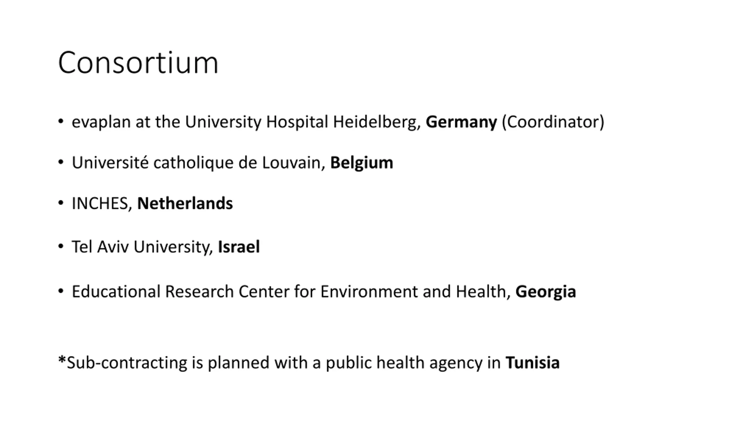 Consortium evaplan at the University Hospital Heidelberg, Germany (Coordinator) Universit catholique de Louvain, Belgium INCHES, Netherlands Tel Aviv University, Israel Educational Research Center for Environment and Health, Georgia *Sub-contracting is planned with a public health agency in Tunisia