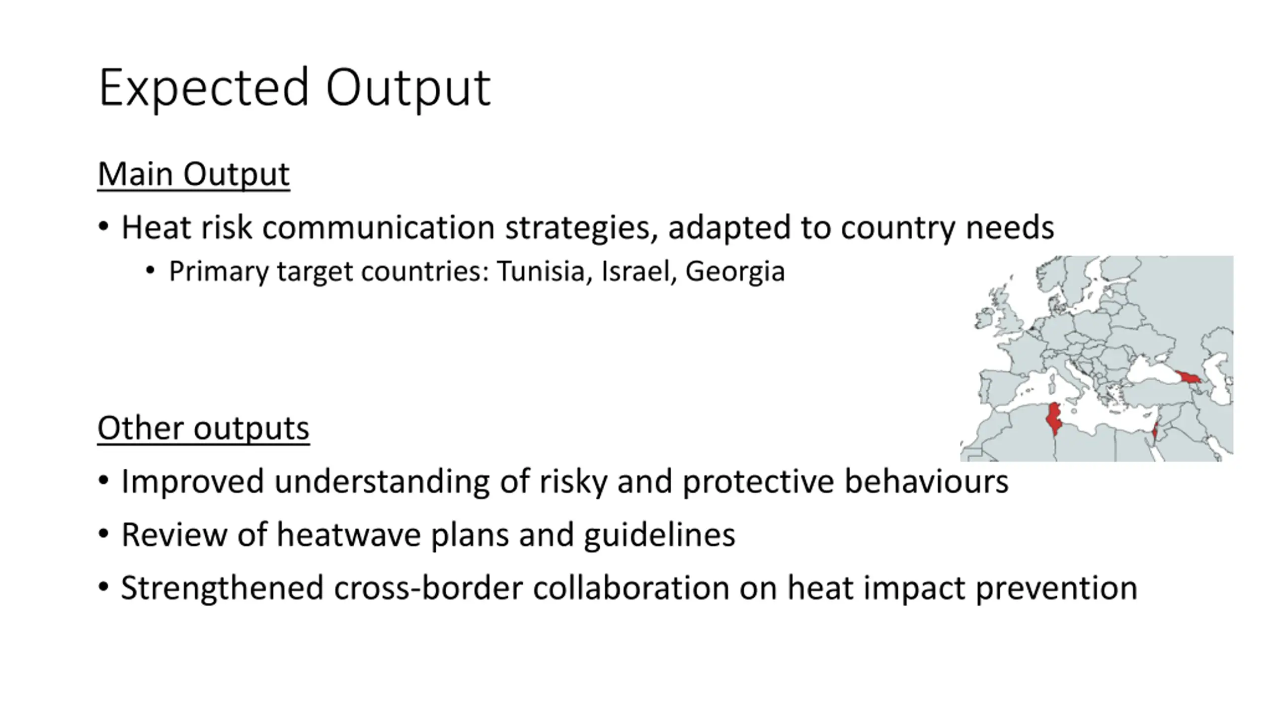 Expected Output Main Output Heat risk communication strategies, adapted to country needs Primary target countries: Tunisia, Israel, Georgia Other outputs Improved understanding of risky and protective behaviours Review of heatwave plans and guidelines Strengthened cross-border collaboration on heat impact prevention