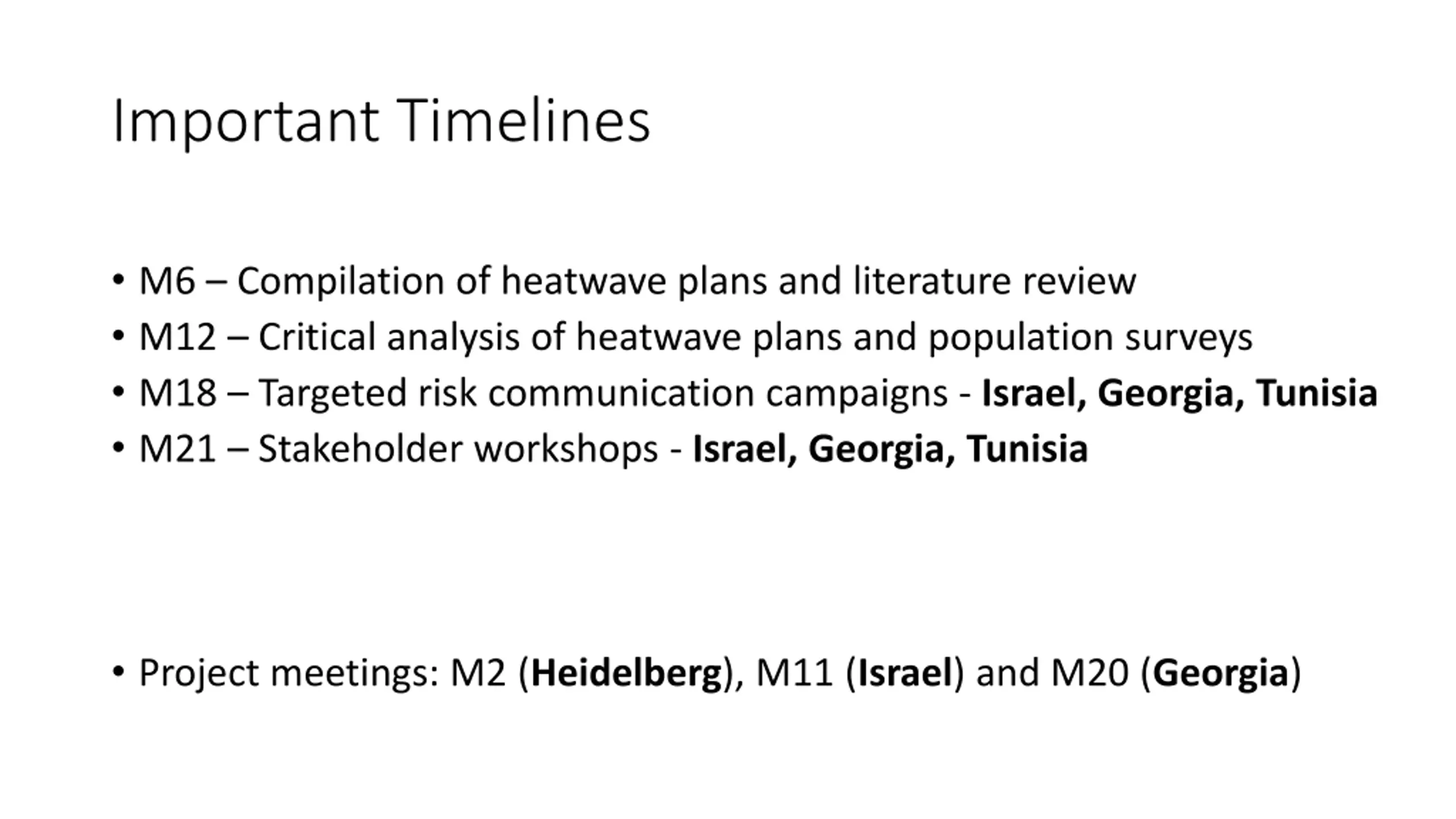 Important Timelines M6 Compilation of heatwave plans and literature review M12 Critical analysis of heatwave plans and population surveys M18 Targeted risk communication campaigns - Israel, Georgia, Tunisia M21 Stakeholder workshops - Israel, Georgia, Tunisia Project meetings: M2 (Heidelberg), M11 (Israel) and M20 (Georgia)