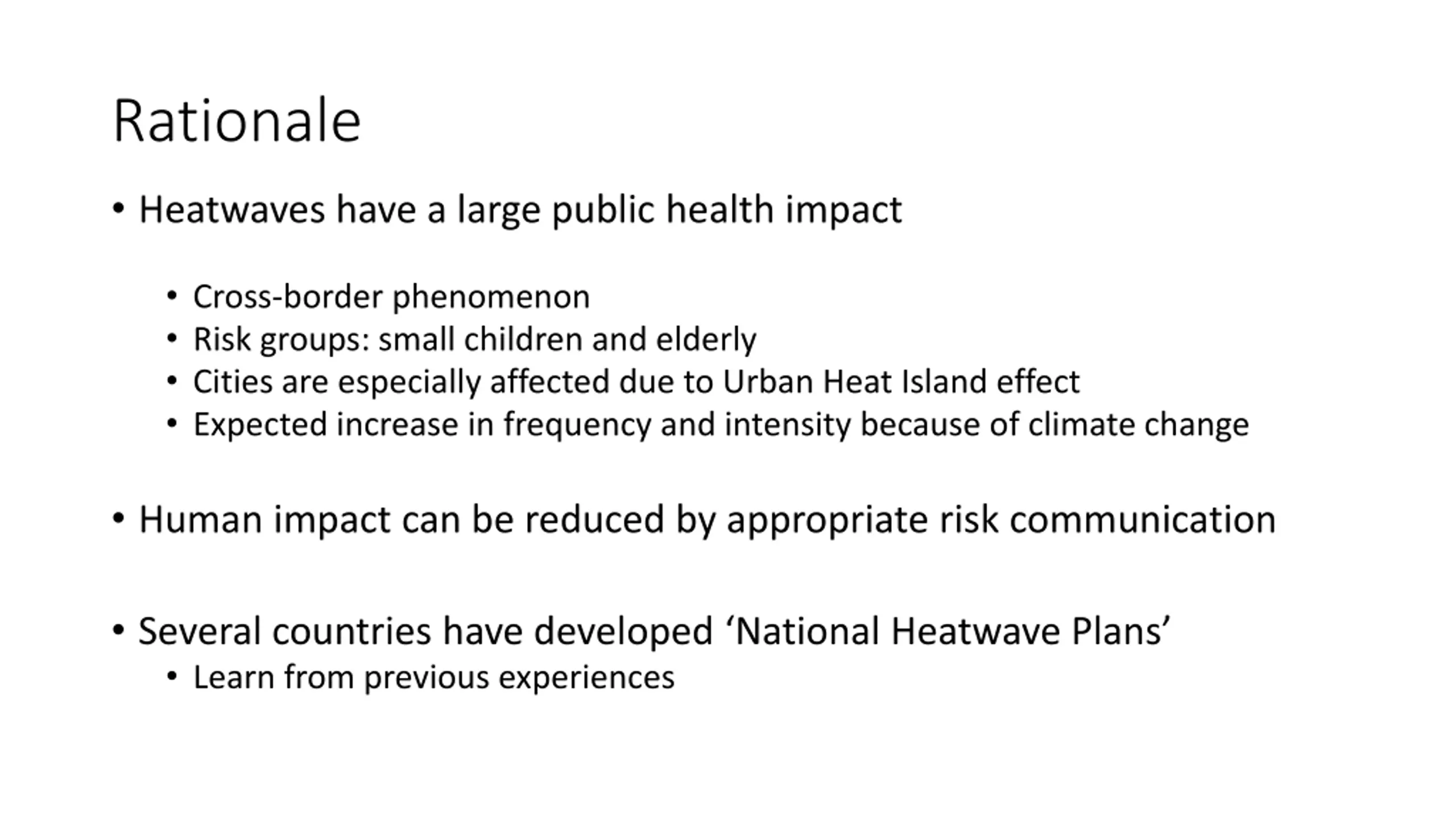 Rationale Heatwaves have a large public health impact Cross-border phenomenon Risk groups: small children and elderly Cities are especially affected due to Urban Heat Island effect Expected increase in frequency and intensity because of climate change Human impact can be reduced by appropriate risk communication Several countries have developed National Heatwave Plans Learn from previous experiences