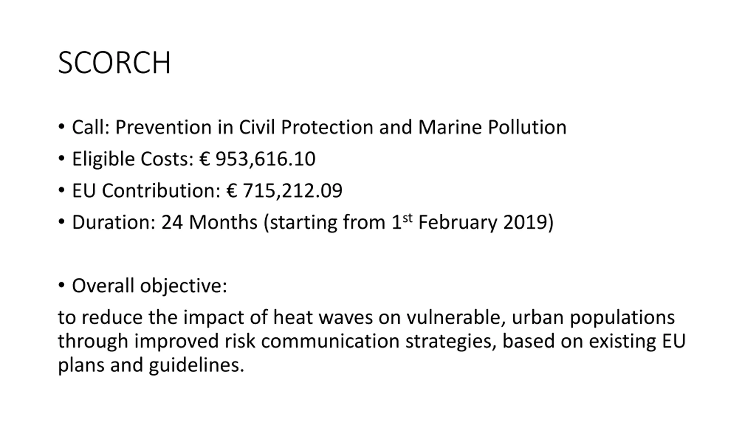 SCORCH Call: Prevention in Civil Protection and Marine Pollution Eligible Costs: 953,616.10 EU Contribution: 715,212.09 Duration: 24 Months (starting from 1stFebruary 2019) Overall objective: to reduce the impact of heat waves on vulnerable, urban populations through improved risk communication strategies, based on existing EU plans and guidelines.