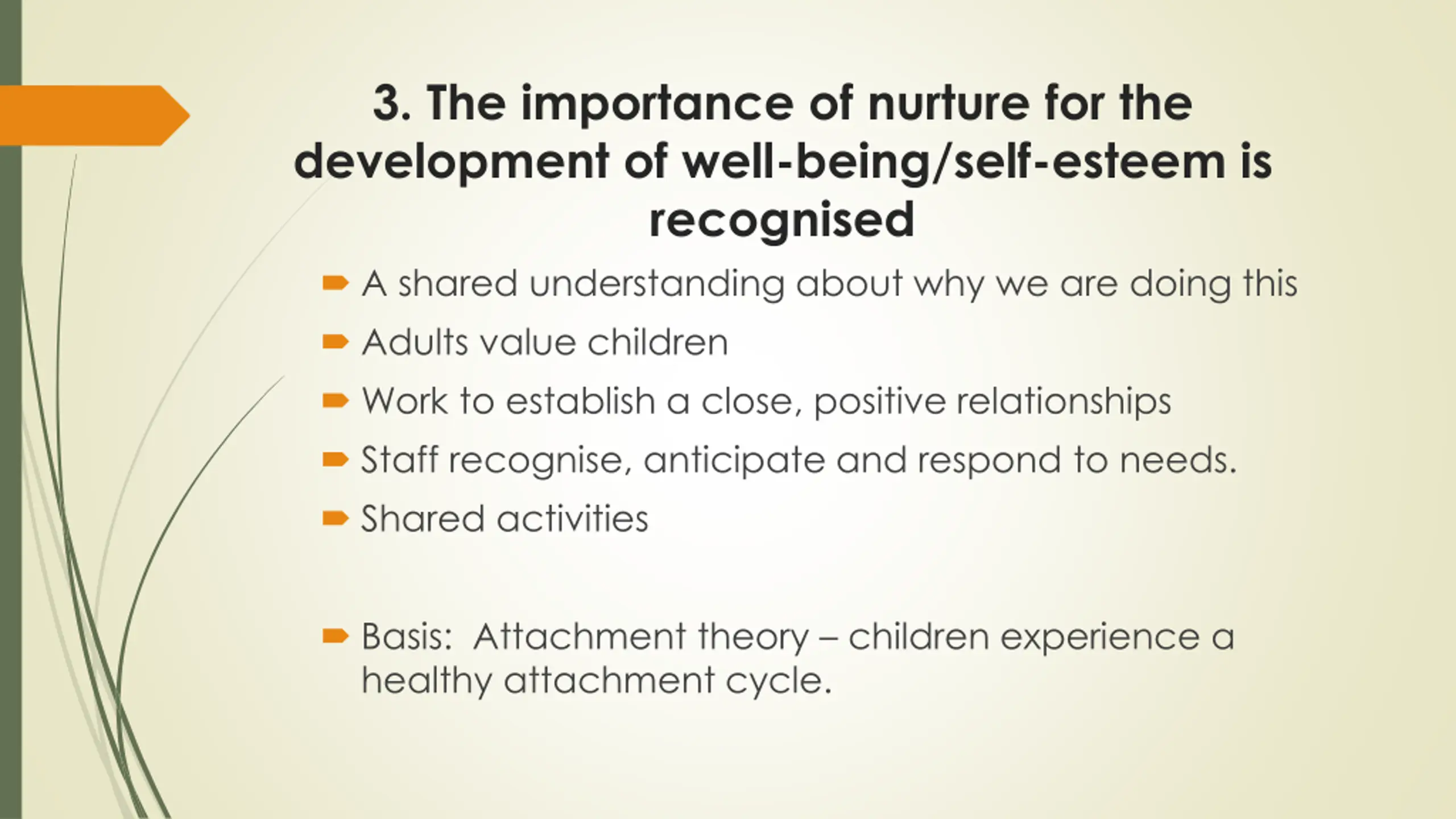 3. The importance of nurture for the development of well-being/self-esteem is recognised A shared understanding about why we are doing this Adults value children Work to establish a close, positive relationships Staff recognise, anticipate and respond to needs. Shared activities Basis: Attachment theory children experience a healthy attachment cycle.