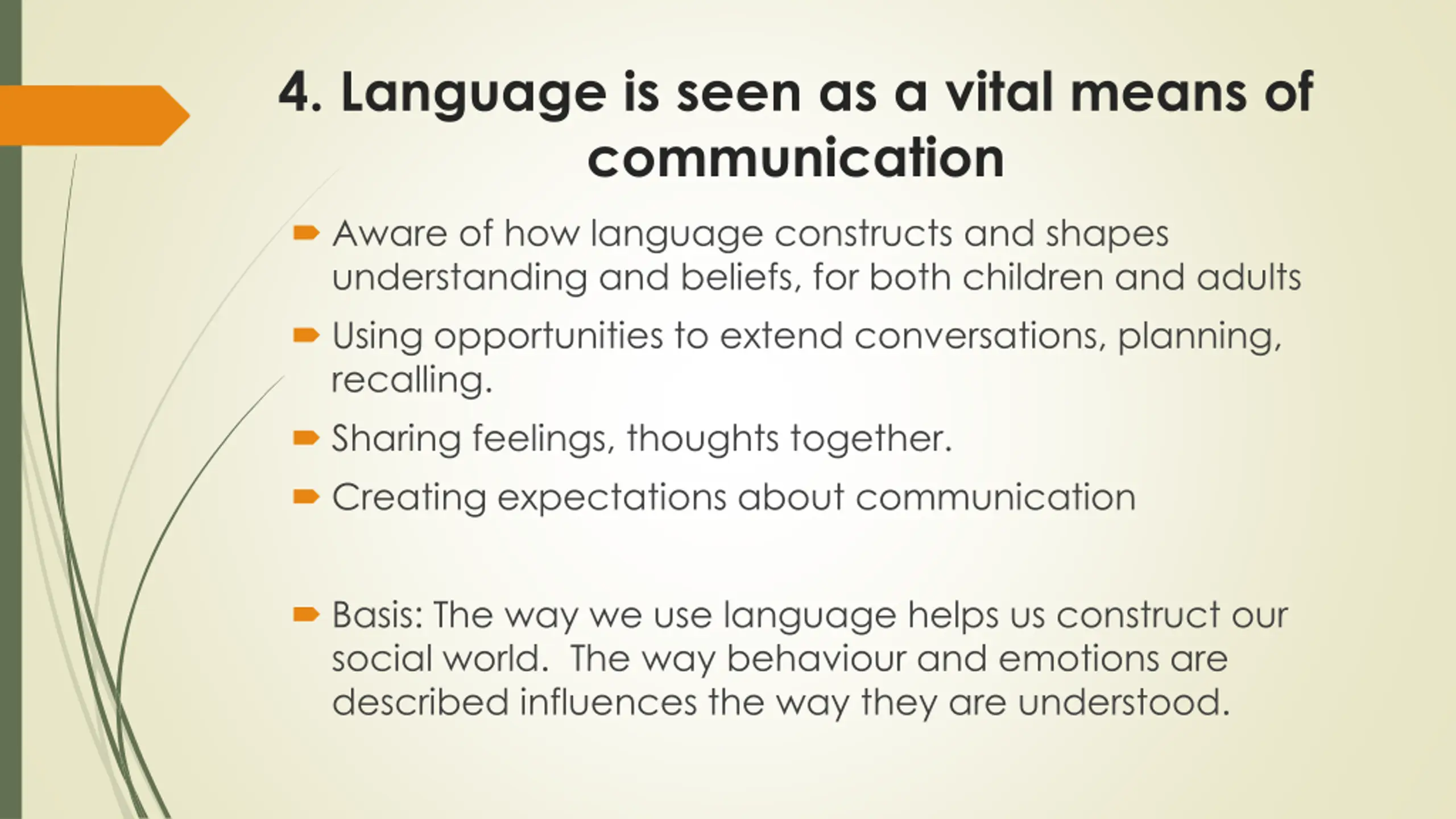 4. Language is seen as a vital means of communication Aware of how language constructs and shapes understanding and beliefs, for both children and adults Using opportunities to extend conversations, planning, recalling. Sharing feelings, thoughts together. Creating expectations about communication Basis: The way we use language helps us construct our social world. The way behaviour and emotions are described influences the way they are understood.