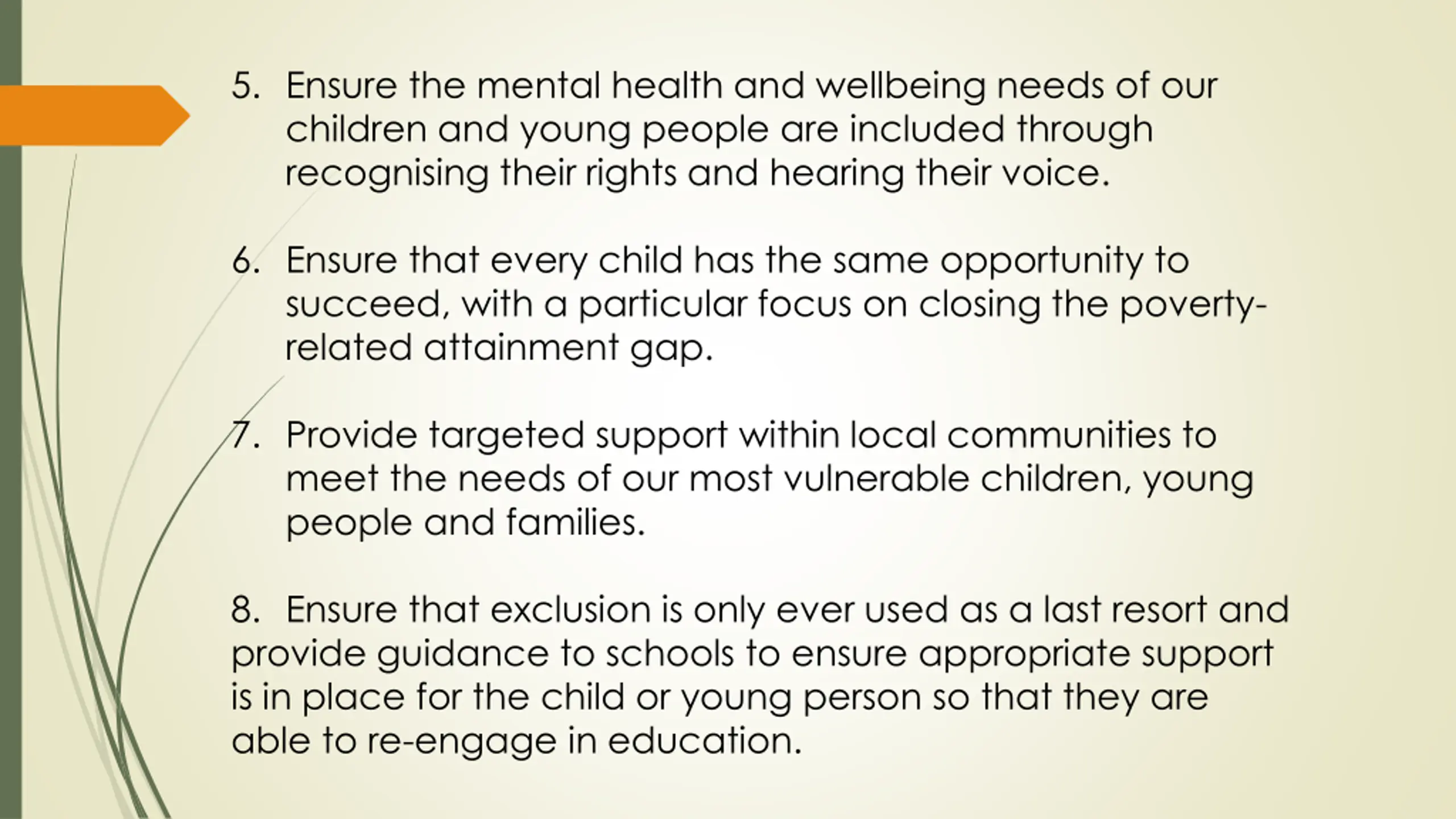 5. Ensure the mental health and wellbeing needs of our children and young people are included through recognising their rights and hearing their voice. 6. Ensure that every child has the same opportunity to succeed, with a particular focus on closing the poverty- related attainment gap. 7. Provide targeted support within local communities to meet the needs of our most vulnerable children, young people and families. 8. Ensure that exclusion is only ever used as a last resort and provide guidance to schools to ensure appropriate support is in place for the child or young person so that they are able to re-engage in education.