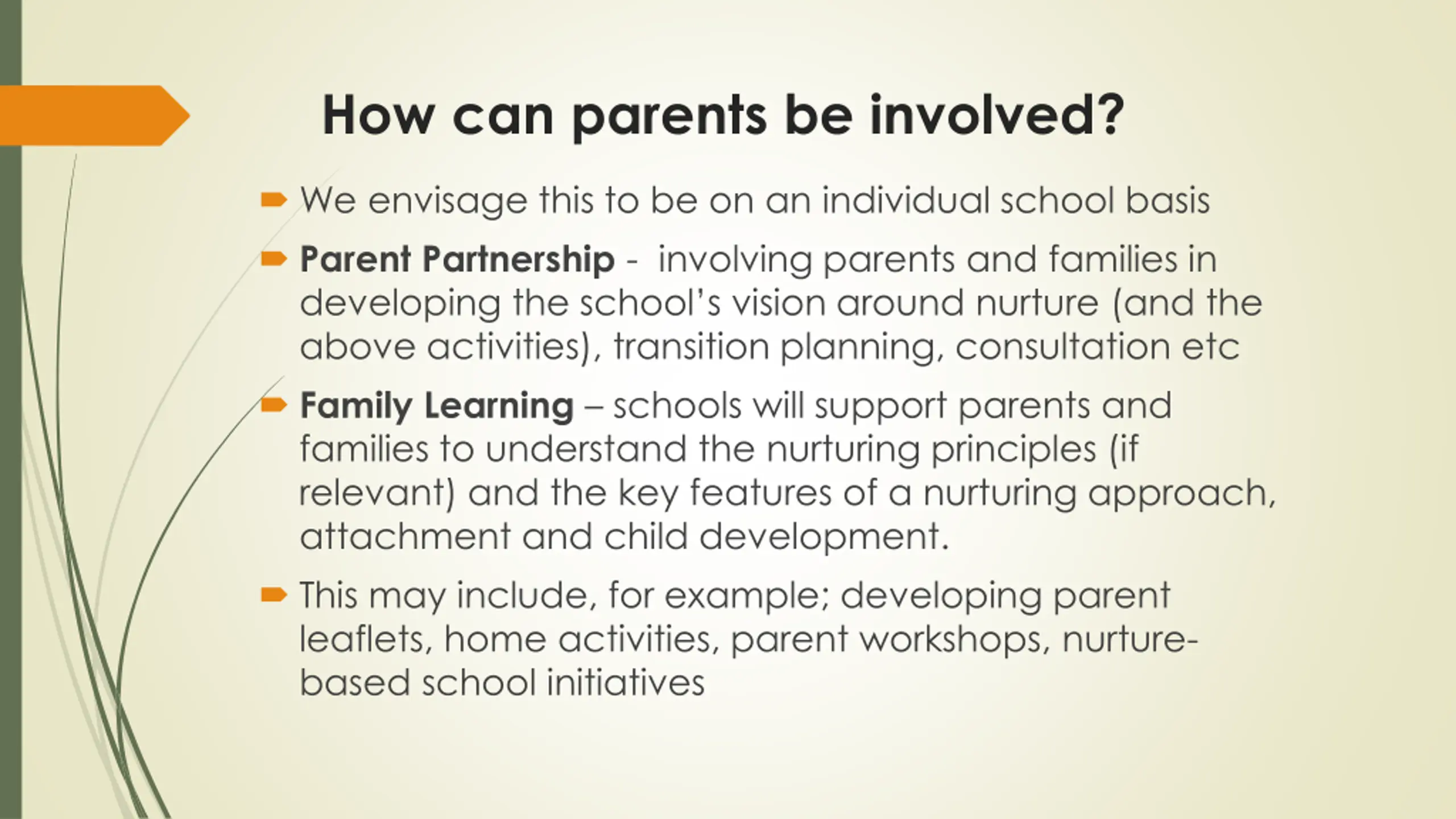 How can parents be involved? We envisage this to be on an individual school basis Parent Partnership - involving parents and families in developing the school s vision around nurture (and the above activities), transition planning, consultation etc Family Learning schools will support parents and families to understand the nurturing principles (if relevant) and the key features of a nurturing approach, attachment and child development. This may include, for example; developing parent leaflets, home activities, parent workshops, nurture- based school initiatives