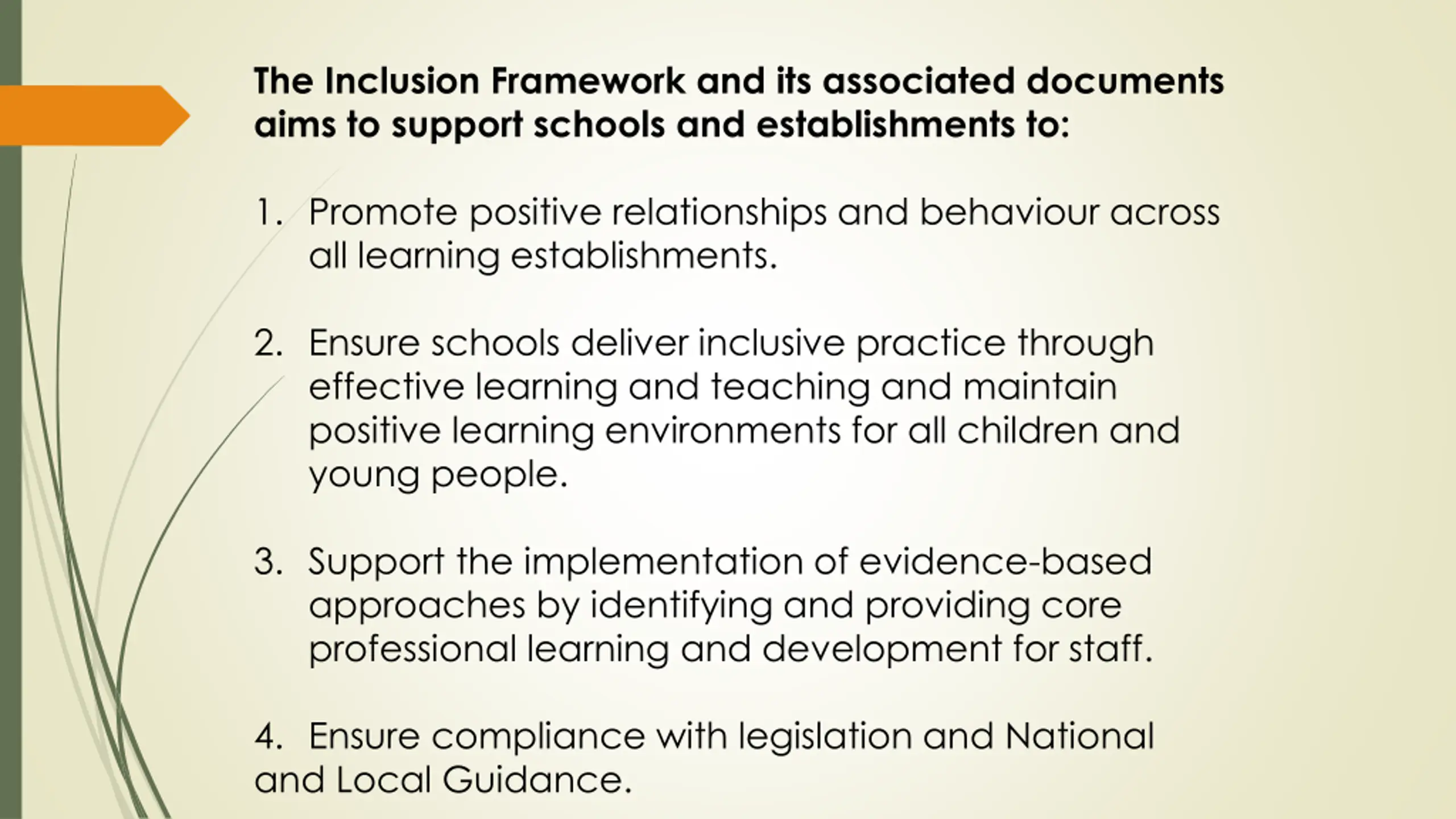The Inclusion Framework and its associated documents aims to support schools and establishments to: 1. Promote positive relationships and behaviour across all learning establishments. 2. Ensure schools deliver inclusive practice through effective learning and teaching and maintain positive learning environments for all children and young people. 3. Support the implementation of evidence-based approaches by identifying and providing core professional learning and development for staff. 4. Ensure compliance with legislation and National and Local Guidance.
