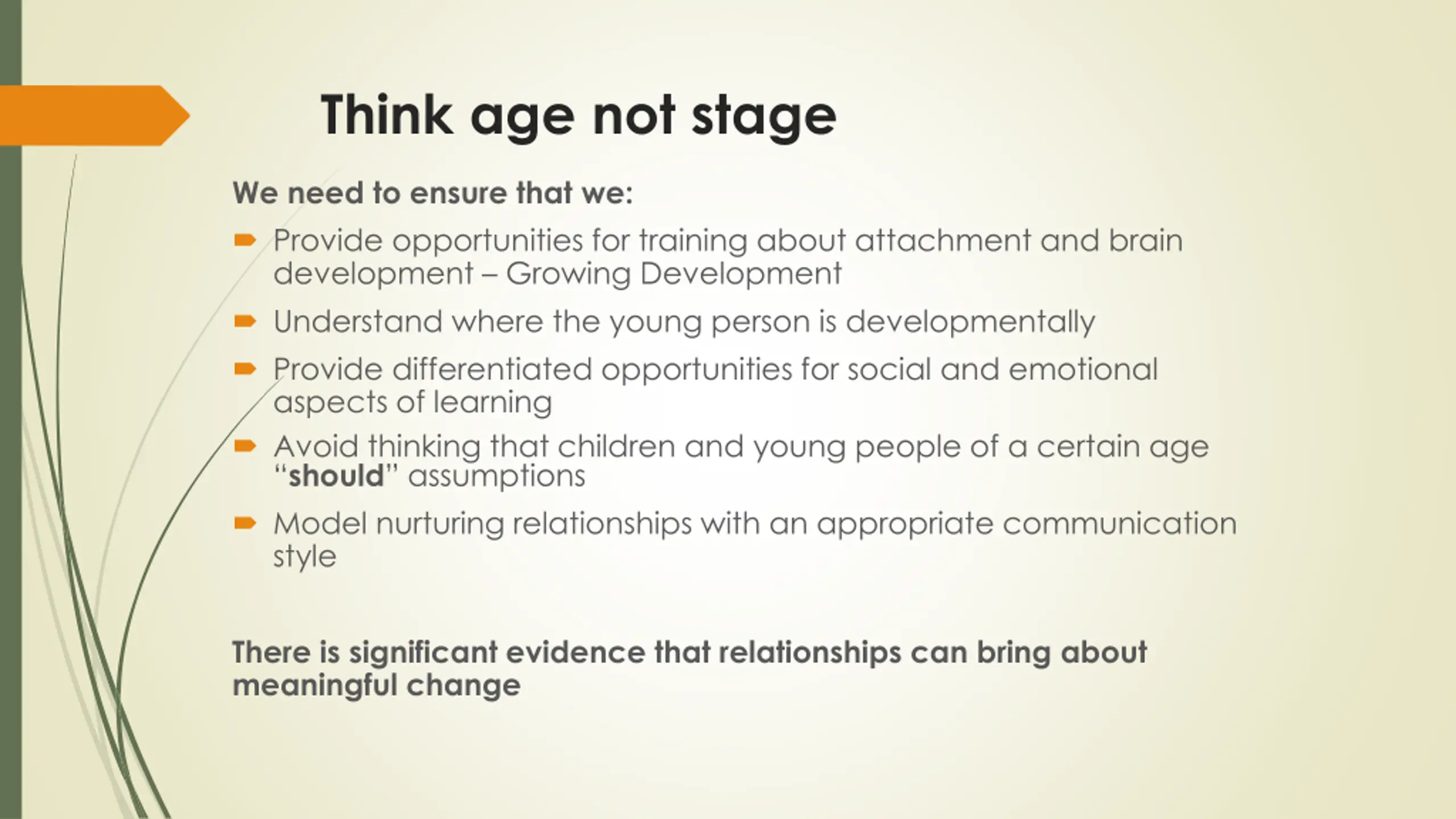 Think age not stage We need to ensure that we: Provide opportunities for training about attachment and brain development Growing Development Understand where the young person is developmentally Provide differentiated opportunities for social and emotional aspects of learning Avoid thinking that children and young people of a certain age should assumptions Model nurturing relationships with an appropriate communication style There is significant evidence that relationships can bring about meaningful change