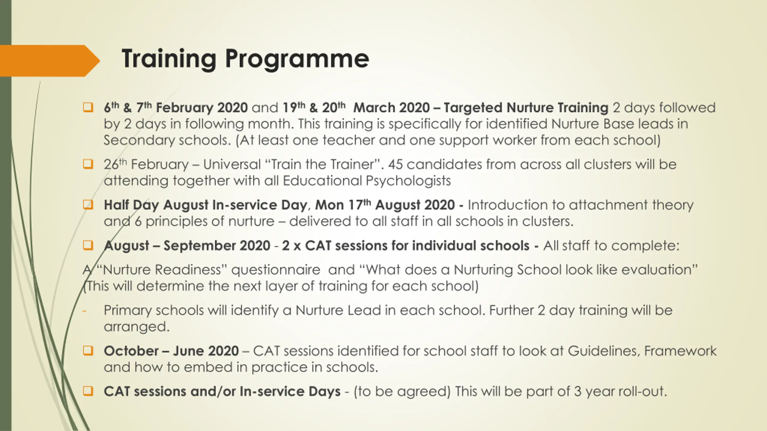 Training Programme 6th & 7th February 2020 and 19th & 20th March 2020 Targeted Nurture Training 2 days followed by 2 days in following month. This training is specifically for identified Nurture Base leads in Secondary schools. (At least one teacher and one support worker from each school) 26th February Universal Train the Trainer . 45 candidates from across all clusters will be attending together with all Educational Psychologists Half Day August In-service Day, Mon 17th August 2020 - Introduction to attachment theory and 6 principles of nurture delivered to all staff in all schools in clusters. August September 2020 - 2 x CAT sessions for individual schools - All staff to complete: A Nurture Readiness questionnaire and What does a Nurturing School look like evaluation (This will determine the next layer of training for each school) - Primary schools will identify a Nurture Lead in each school. Further 2 day training will be arranged. October June 2020 CAT sessions identified for school staff to look at Guidelines, Framework and how to embed in practice in schools. CAT sessions and/or In-service Days - (to be agreed) This will be part of 3 year roll-out.