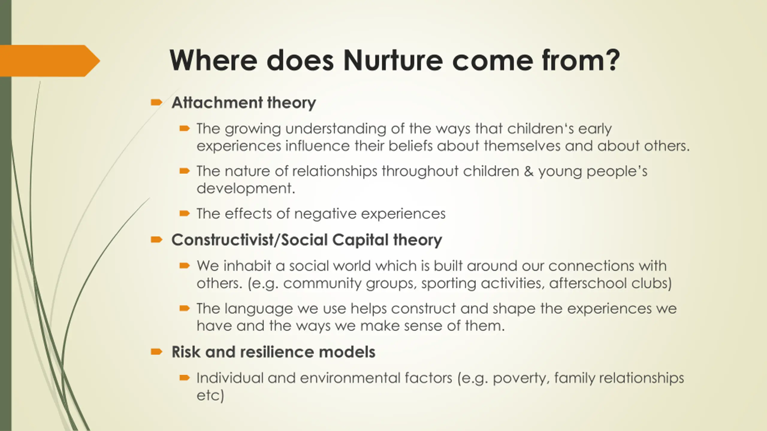 Where does Nurture come from? Attachment theory The growing understanding of the ways that children s early experiences influence their beliefs about themselves and about others. The nature of relationships throughout children & young people s development. The effects of negative experiences Constructivist/Social Capital theory We inhabit a social world which is built around our connections with others. (e.g. community groups, sporting activities, afterschool clubs) The language we use helps construct and shape the experiences we have and the ways we make sense of them. Risk and resilience models Individual and environmental factors (e.g. poverty, family relationships etc)