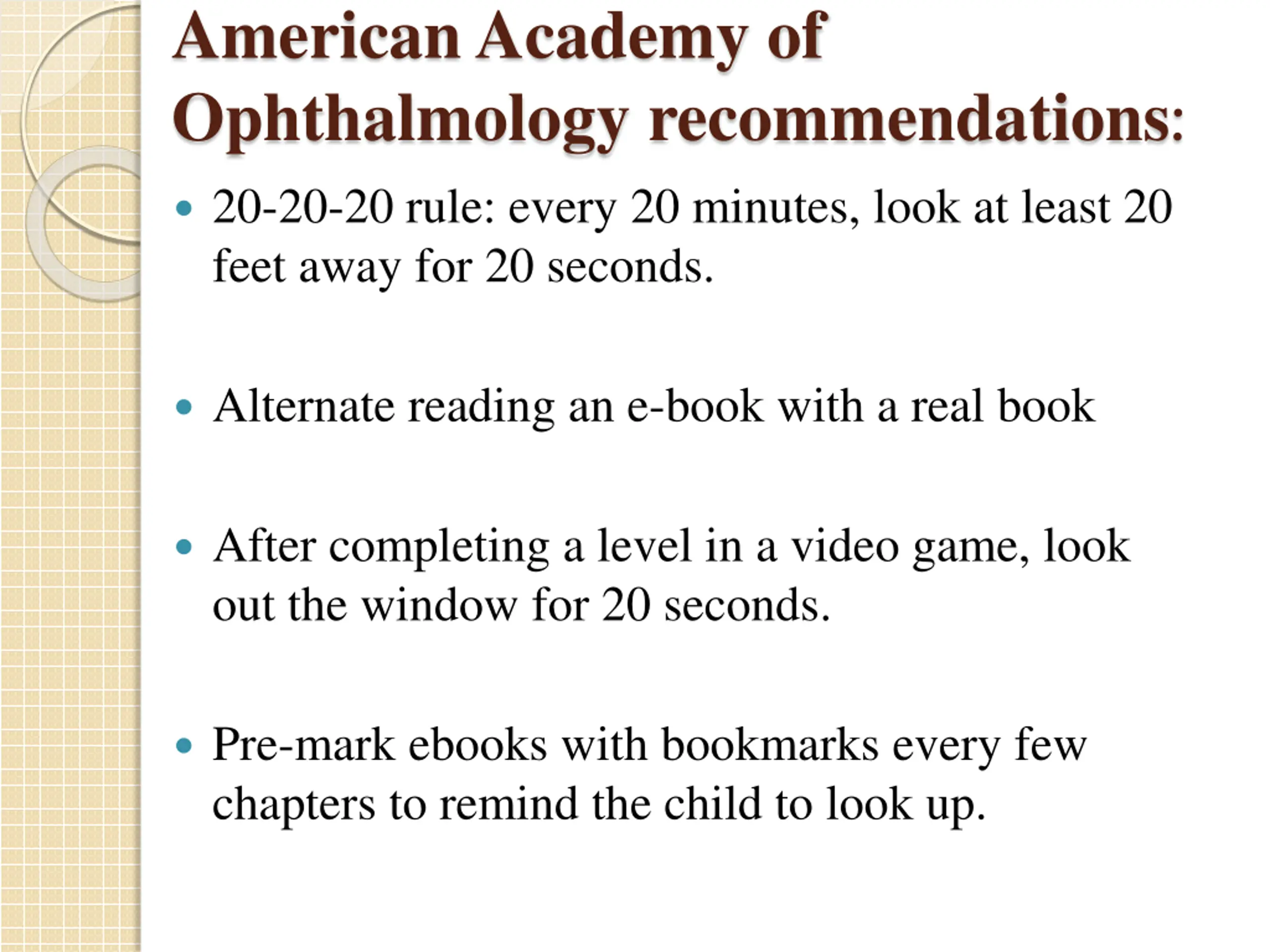 American Academy of Ophthalmology recommendations: 20-20-20 rule: every 20 minutes, look at least 20 feet away for 20 seconds. Alternate reading an e-book with a real book After completing a level in a video game, look out the window for 20 seconds. Pre-mark ebooks with bookmarks every few chapters to remind the child to look up.
