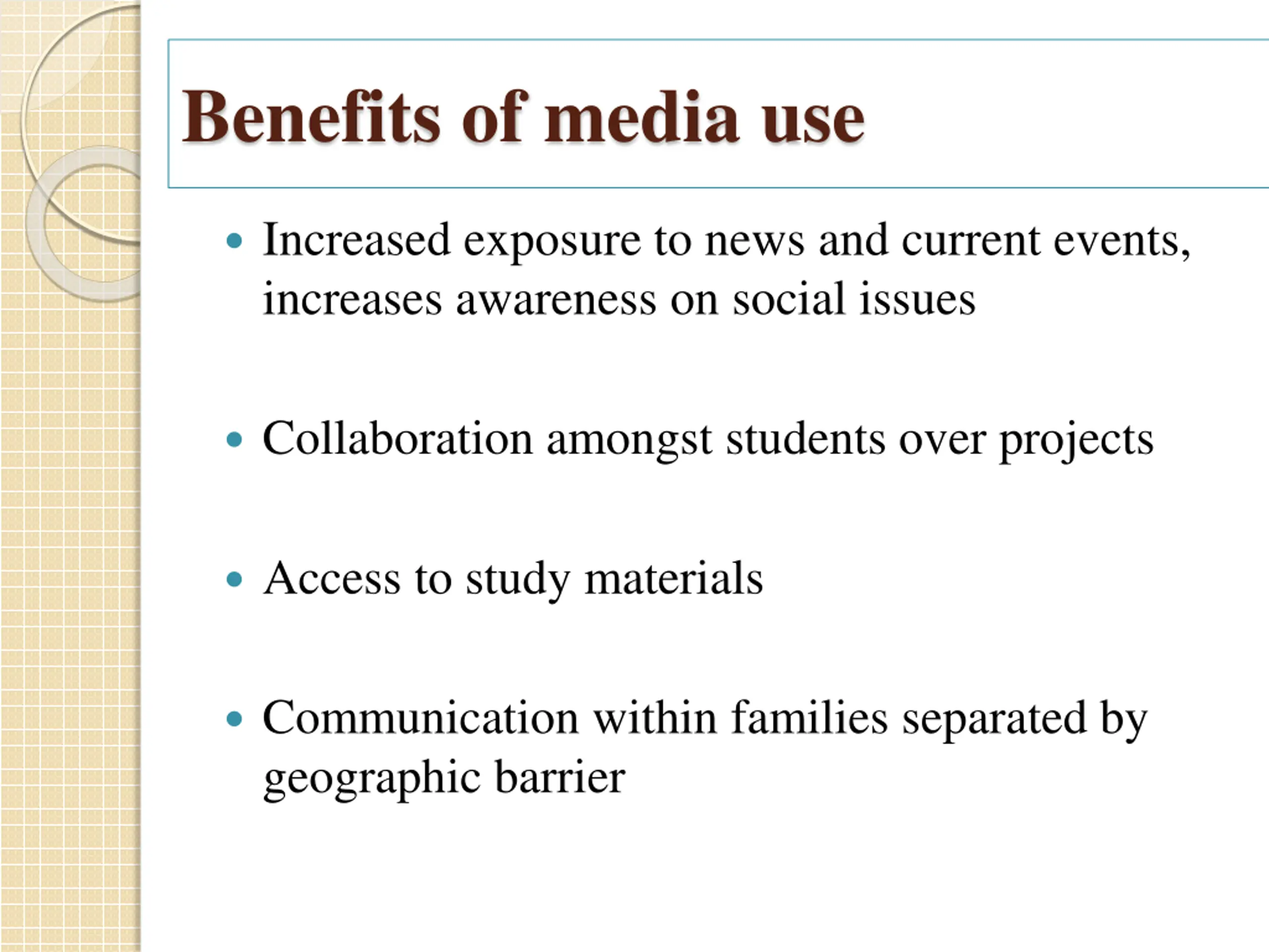 Benefits of media use Increased exposure to news and current events, increases awareness on social issues Collaboration amongst students over projects Access to study materials Communication within families separated by geographic barrier