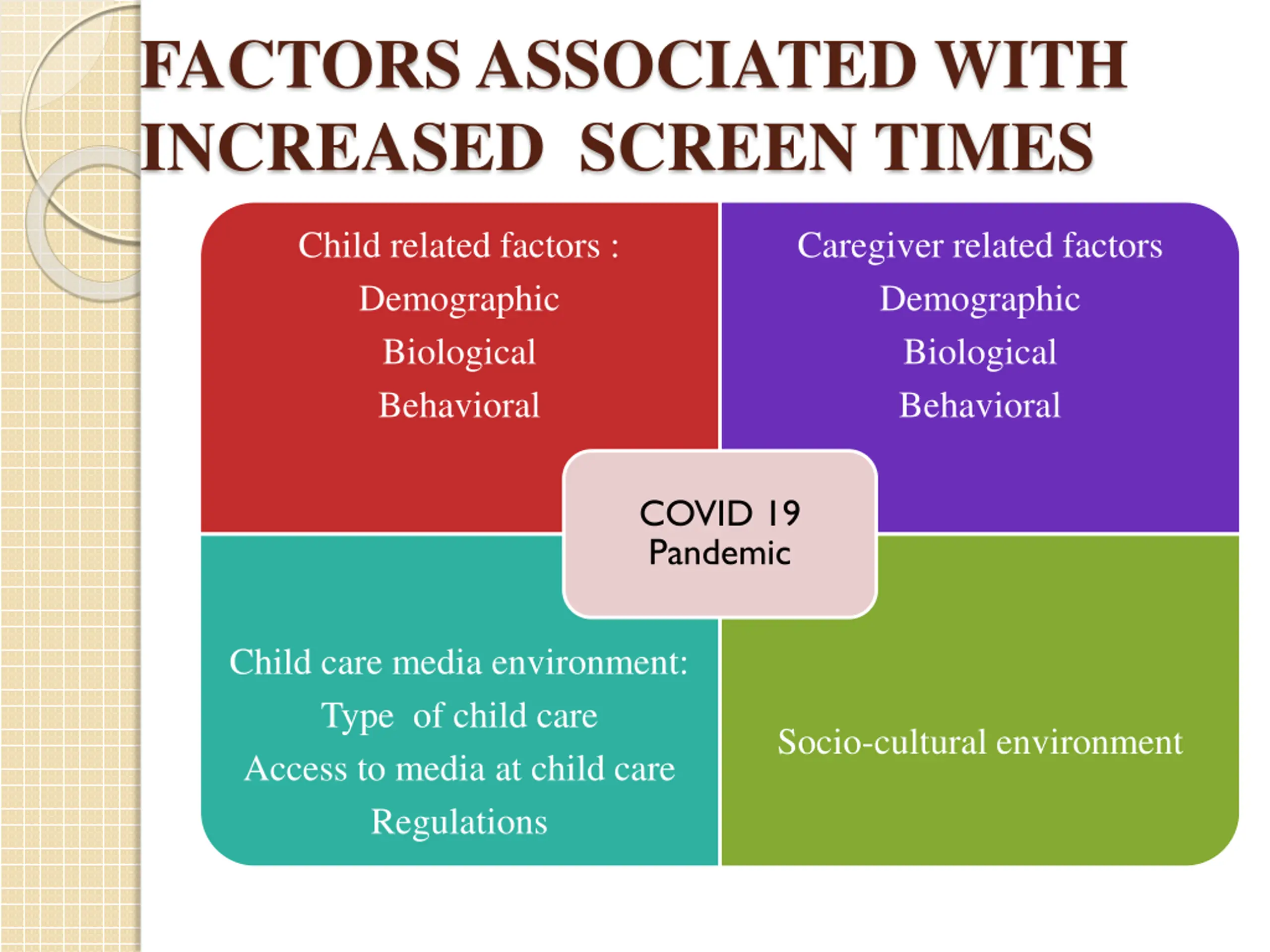 FACTORS ASSOCIATED WITH INCREASED SCREEN TIMES Child related factors : Demographic Biological Behavioral Caregiver related factors Demographic Biological Behavioral COVID 19 Pandemic Child care media environment: Type of child care Access to media at child care Regulations Socio-cultural environment