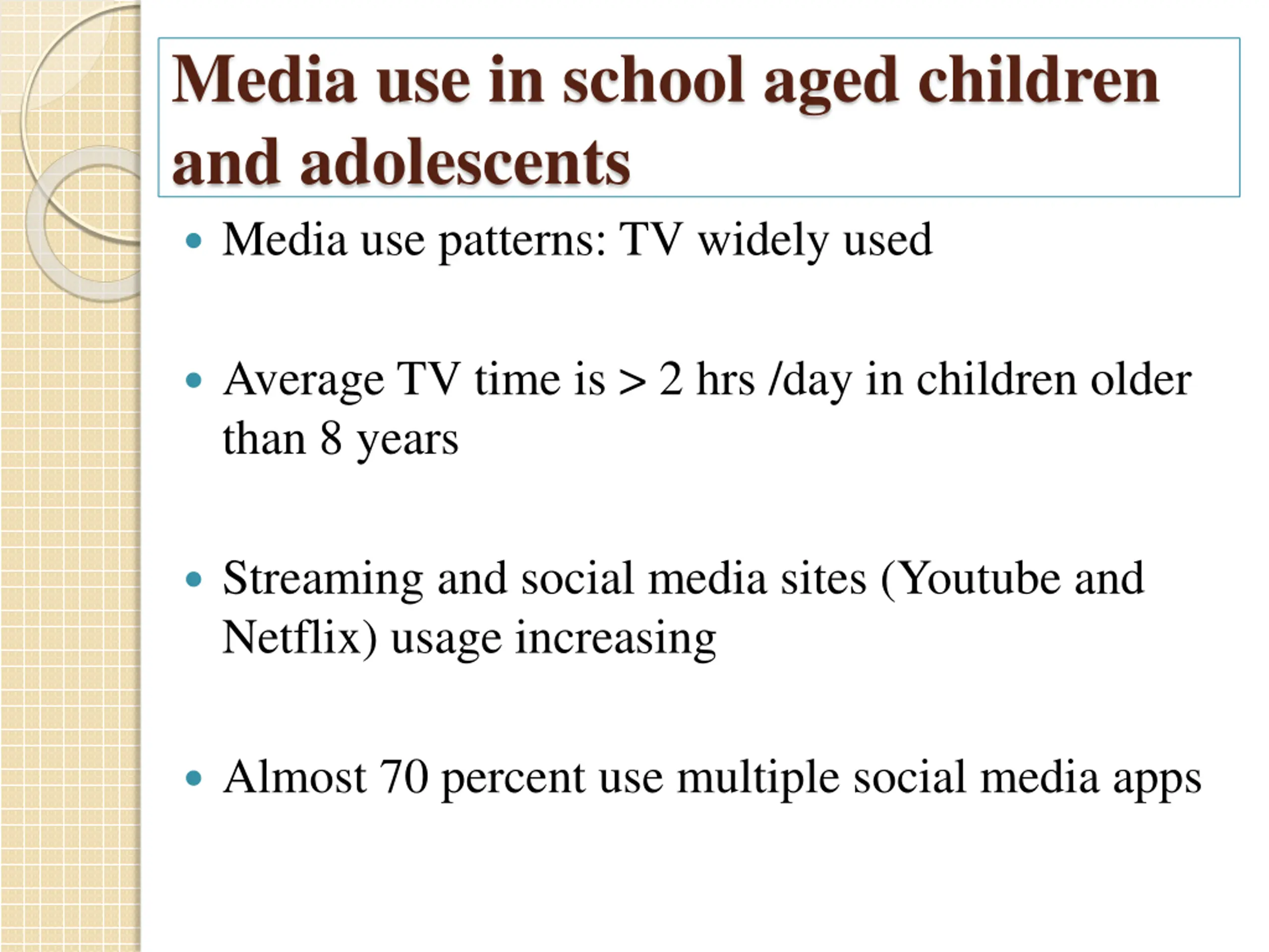Media use in school aged children and adolescents Media use patterns: TV widely used Average TV time is > 2 hrs /day in children older than 8 years Streaming and social media sites (Youtube and Netflix) usage increasing Almost 70 percent use multiple social media apps