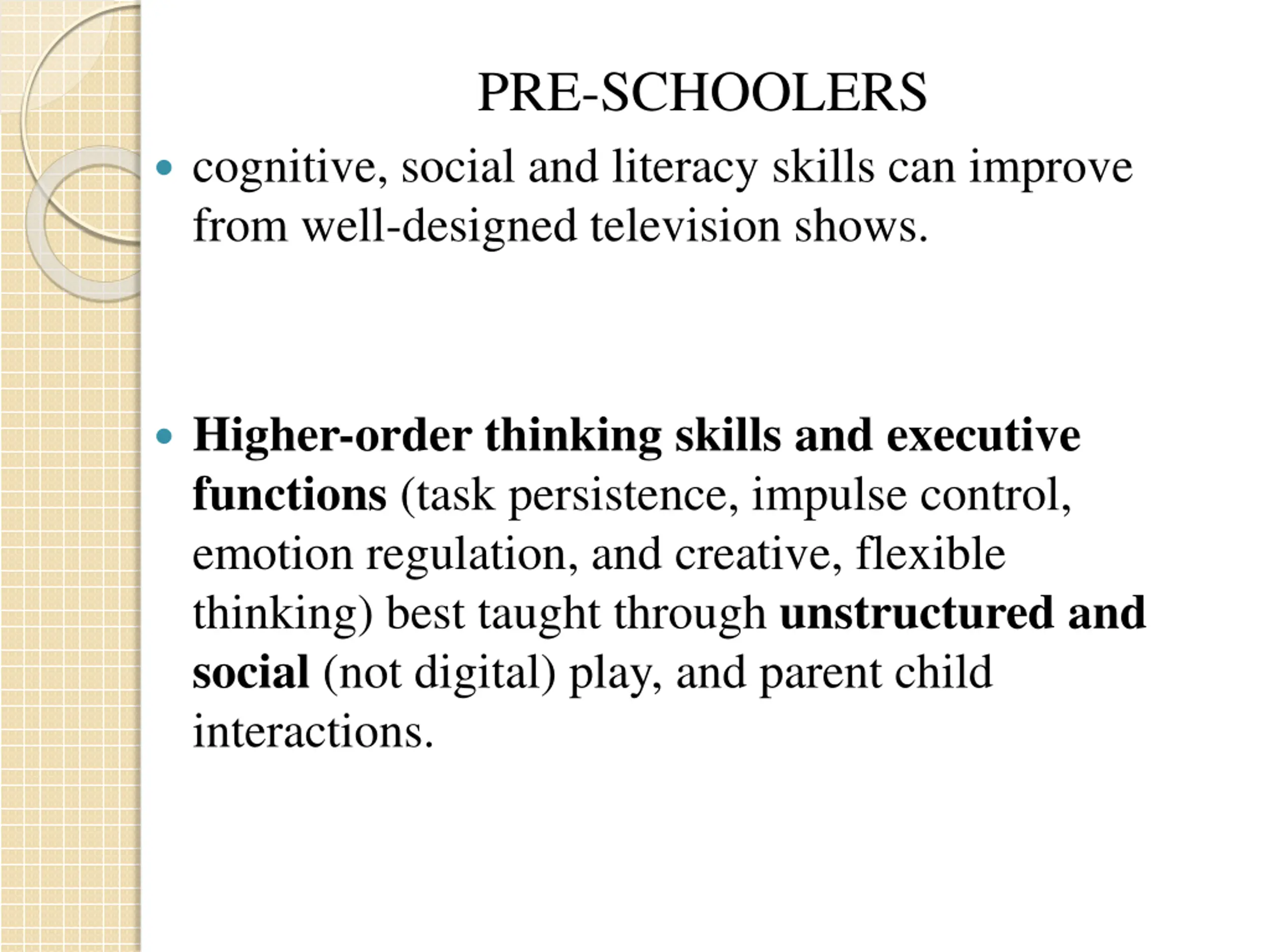 PRE-SCHOOLERS cognitive, social and literacy skills can improve from well-designed television shows. Higher-order thinking skills and executive functions (task persistence, impulse control, emotion regulation, and creative, flexible thinking) best taught through unstructured and social (not digital) play, and parent child interactions.