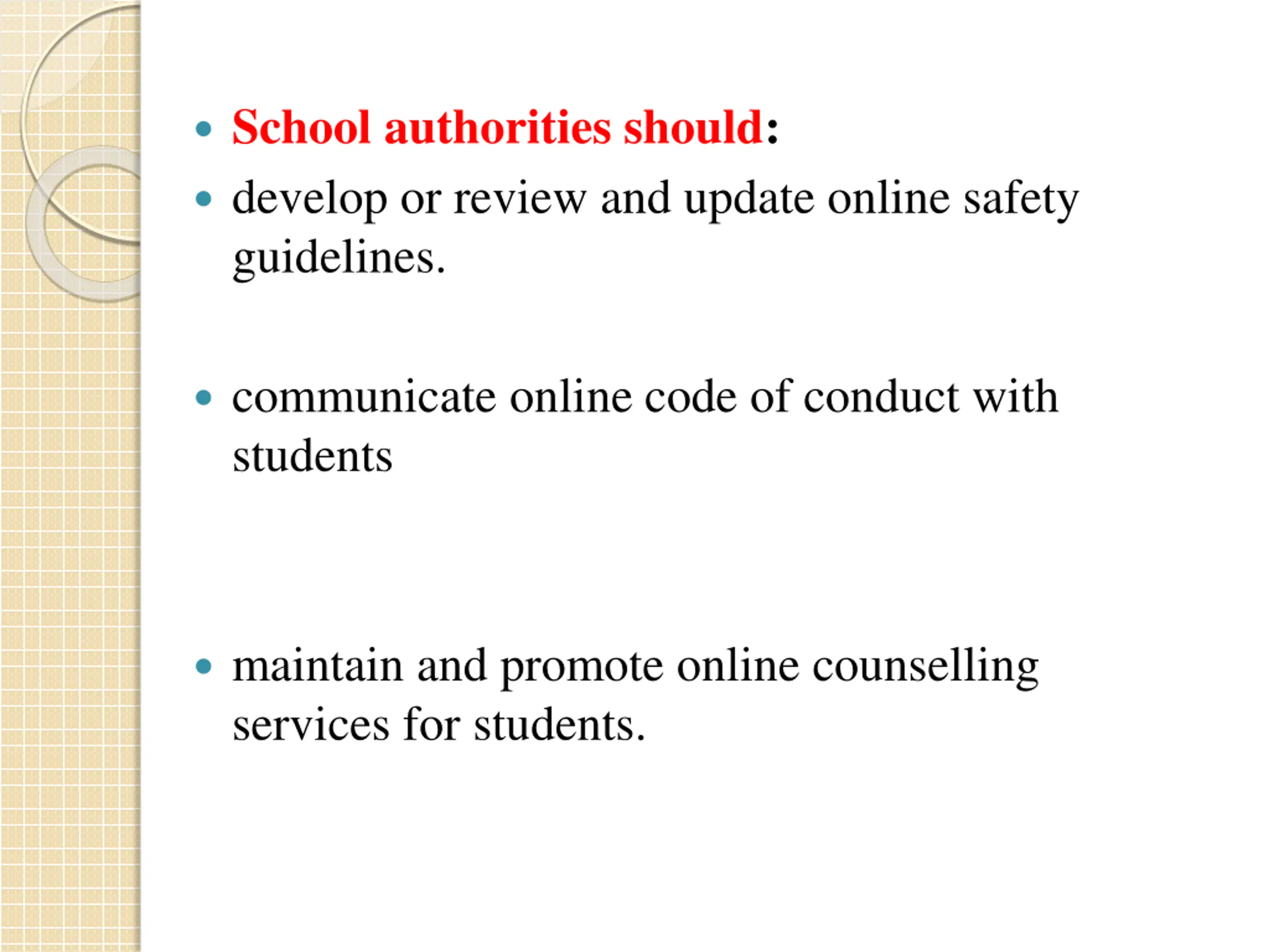 School authorities should: develop or review and update online safety guidelines. communicate online code of conduct with students maintain and promote online counselling services for students.