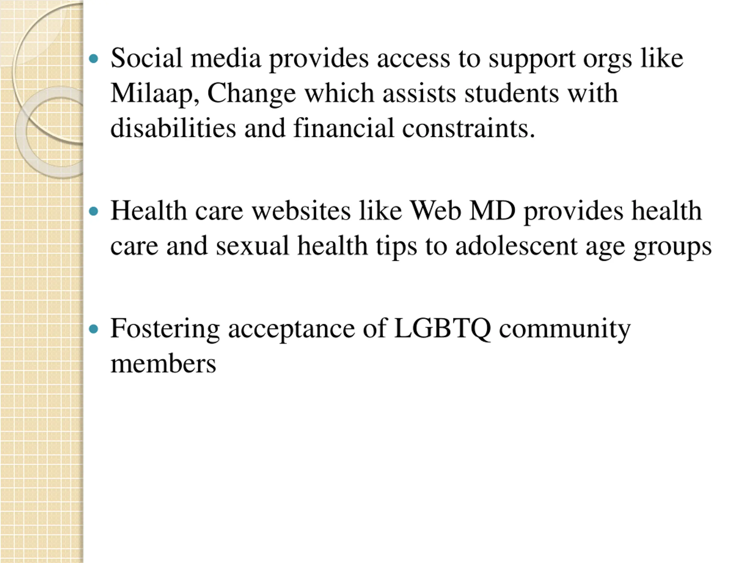 Social media provides access to support orgs like Milaap, Change which assists students with disabilities and financial constraints. Health care websites like Web MD provides health care and sexual health tips to adolescent age groups Fostering acceptance of LGBTQ community members