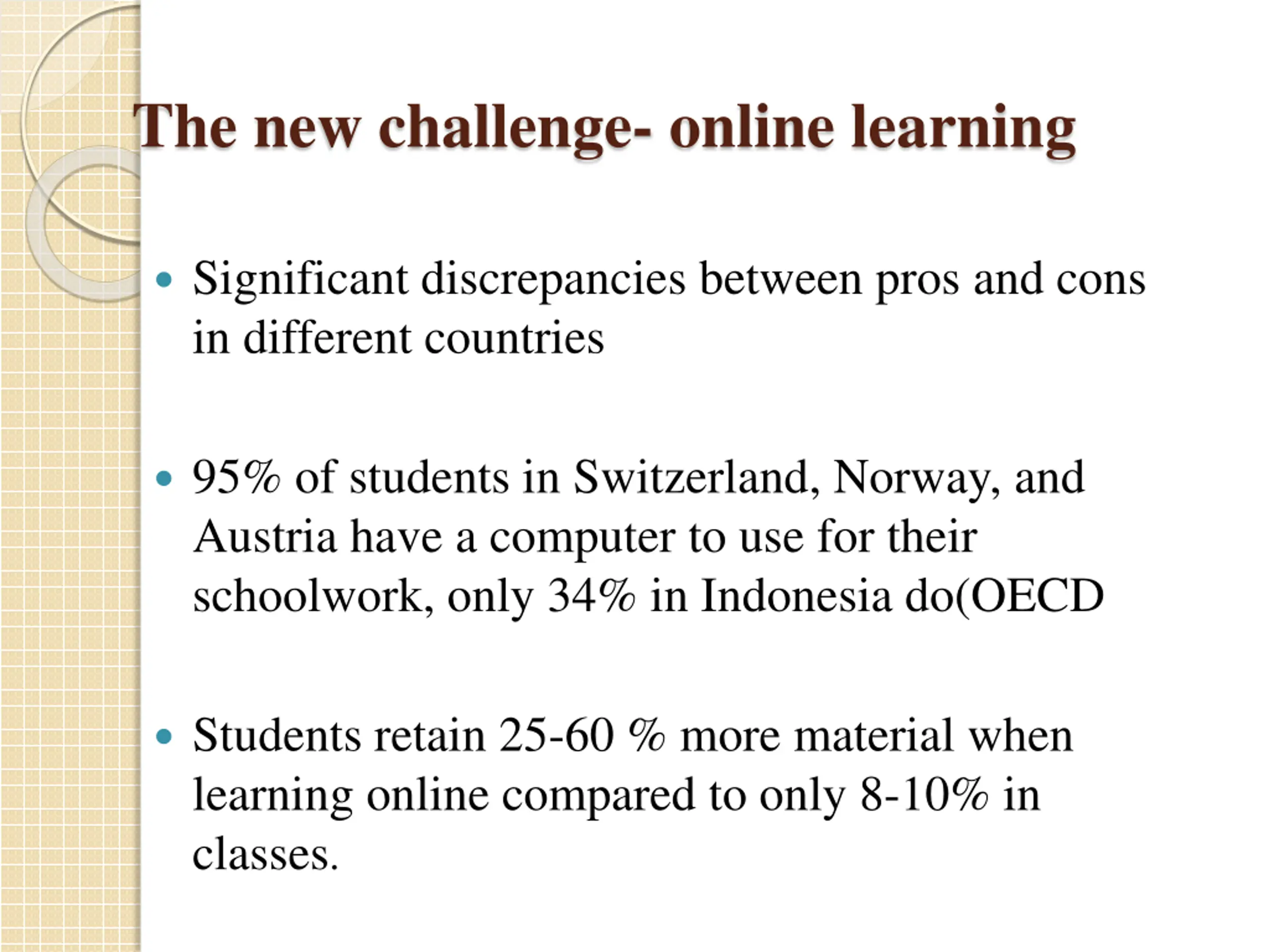 The new challenge- online learning Significant discrepancies between pros and cons in different countries 95% of students in Switzerland, Norway, and Austria have a computer to use for their schoolwork, only 34% in Indonesia do(OECD Students retain 25-60 % more material when learning online compared to only 8-10% in classes.