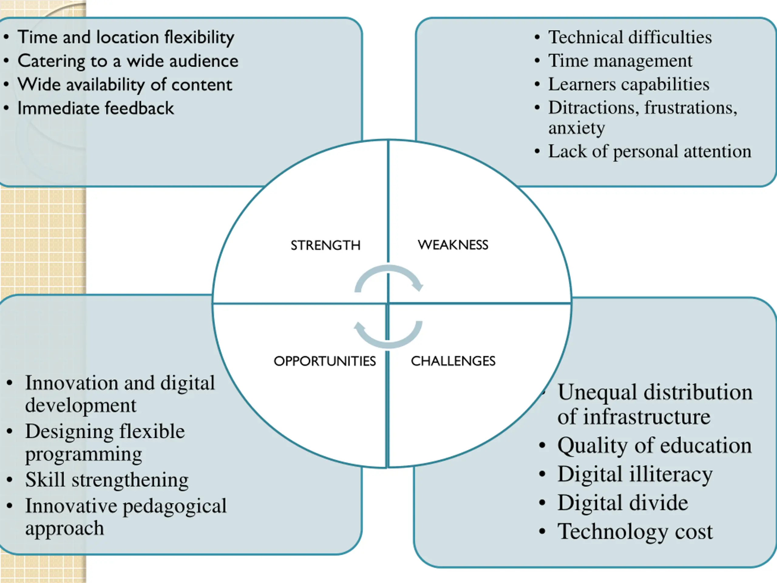Time and location flexibility Catering to a wide audience Wide availability of content Immediate feedback Technical difficulties Time management Learners capabilities Ditractions, frustrations, anxiety Lack of personal attention WEAKNESS STRENGTH CHALLENGES OPPORTUNITIES Innovation and digital development Designing flexible programming Skill strengthening Innovative pedagogical approach Unequal distribution of infrastructure Quality of education Digital illiteracy Digital divide Technology cost