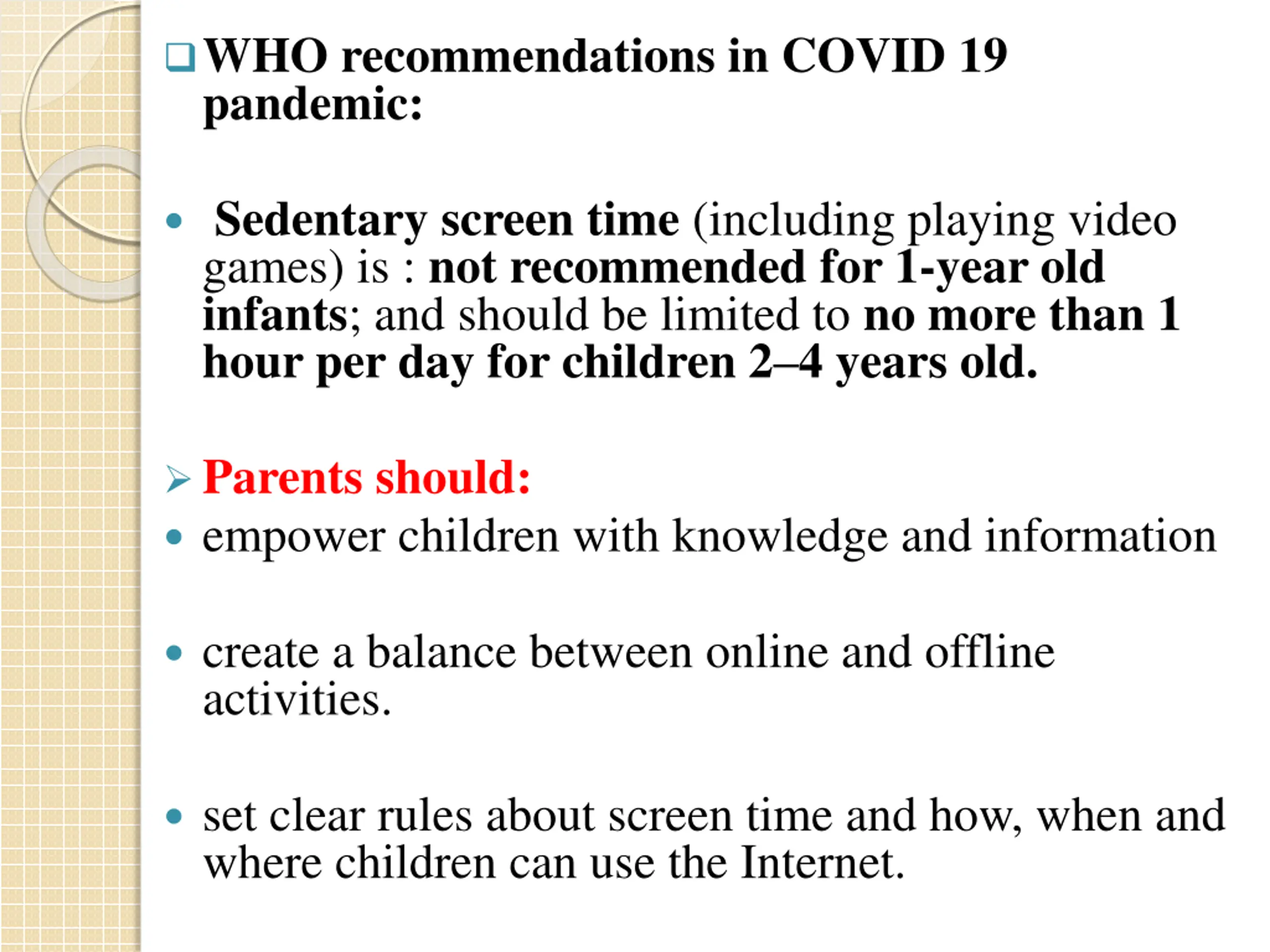 WHO recommendations in COVID 19 pandemic: Sedentary screen time (including playing video games) is : not recommended for 1-year old infants; and should be limited to no more than 1 hour per day for children 2 4 years old. Parents should: empower children with knowledge and information create a balance between online and offline activities. set clear rules about screen time and how, when and where children can use the Internet.