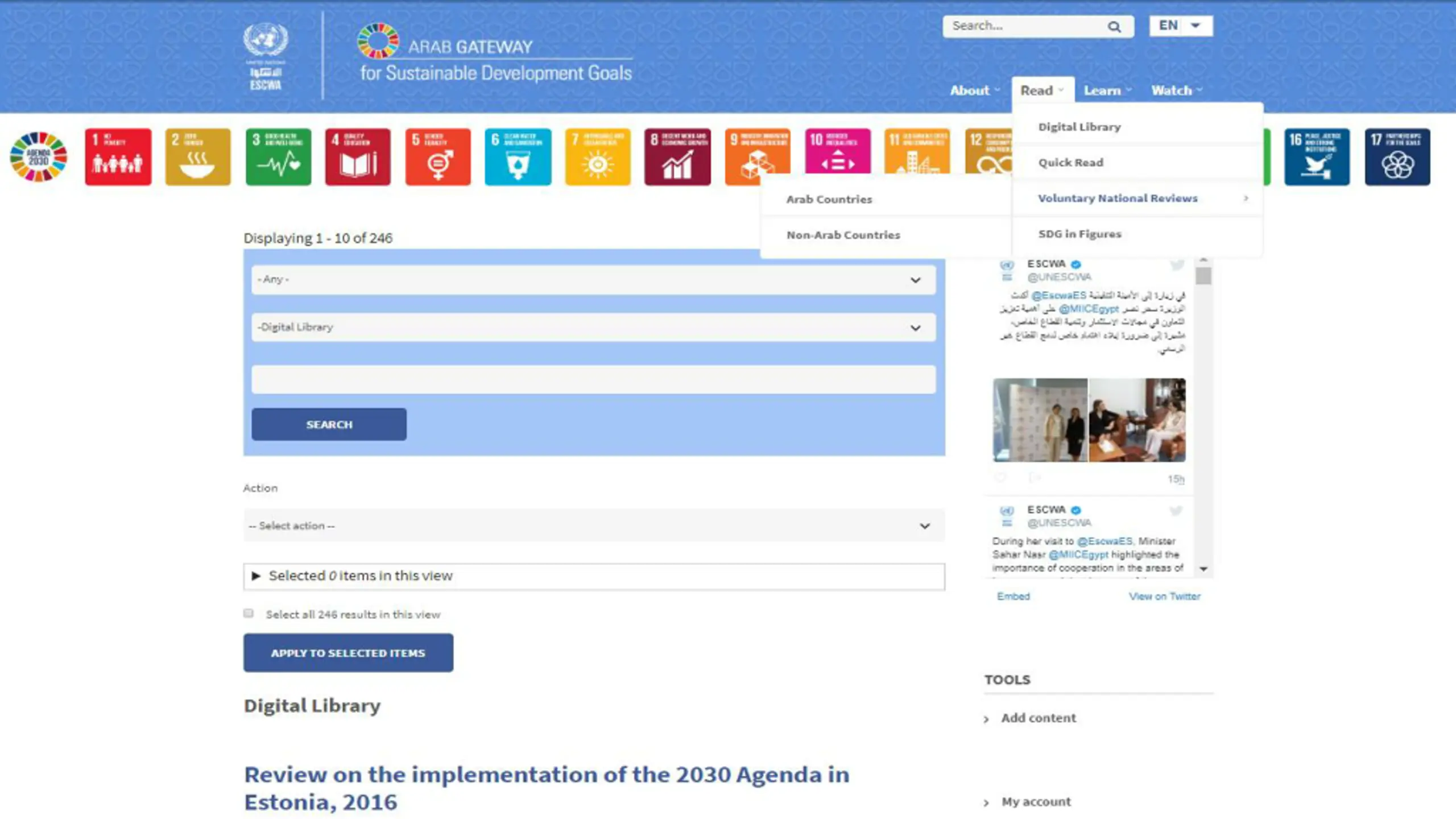 What does UNESCWA do? Meetings and seminars at the national and regional levels; national workshops, parliamentary forum on the 2030 Agenda for Sustainable Development in the Arab Region, the Arab Forum for Sustainable Development, training seminars for directors of government training institutes, VNR Workshops, Learning Conferences, etc. Active participation at High-level Political Forum on Sustainable Development, United Nations General Assembly Summit on Sustainable Development Technical advice and assistance through advisory missions to member states Coordination with all partners/stakeholders (UN agencies and programs, regional and international organization, development banks, civil society, academia, private sector & others to support member states in implementing their national development plans Reports and working papers on; progress in 2030 Agenda, role of parliaments, role of civil society organizations, and other topics related to 2030 Agenda Page 10 Establishment of E-Portals (data portal, SDG Gateway, SME Portal, etc. )