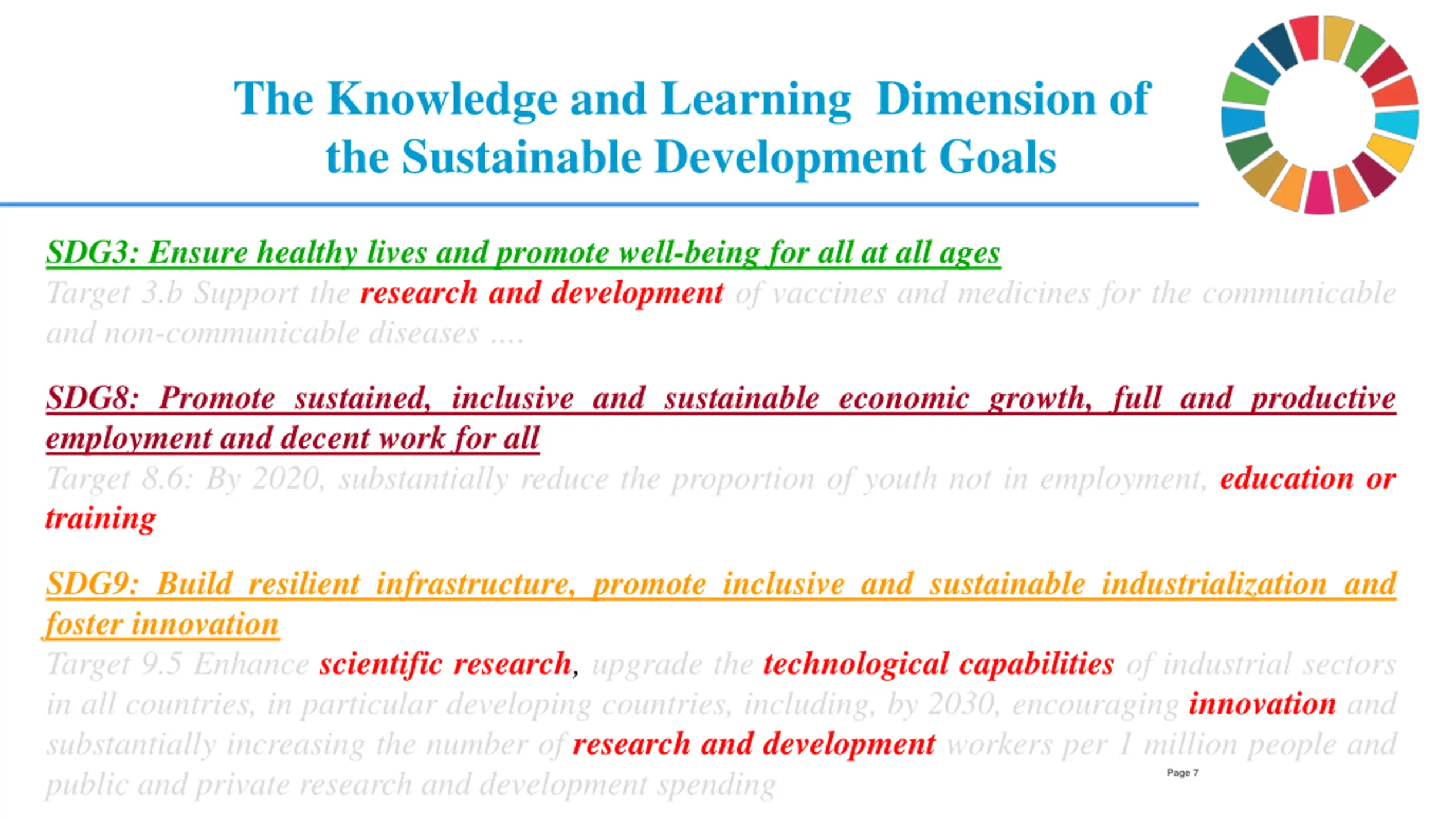 The Knowledge and Learning Dimension of the Sustainable Development Goals SDG3: Ensure healthy lives and promote well-being for all at all ages Target 3.b Support the research and development of vaccines and medicines for the communicable and non-communicable diseases . SDG8: Promote sustained, inclusive and sustainable economic growth, full and productive employment and decent work for all Target 8.6: By 2020, substantially reduce the proportion of youth not in employment, education or training SDG9: Build resilient infrastructure, promote inclusive and sustainable industrialization and foster innovation Target 9.5 Enhance scientific research, upgrade the technological capabilities of industrial sectors in all countries, in particular developing countries, including, by 2030, encouraging innovation and substantially increasing the number of research and development workers per 1 million people and public and private research and development spending Page 7