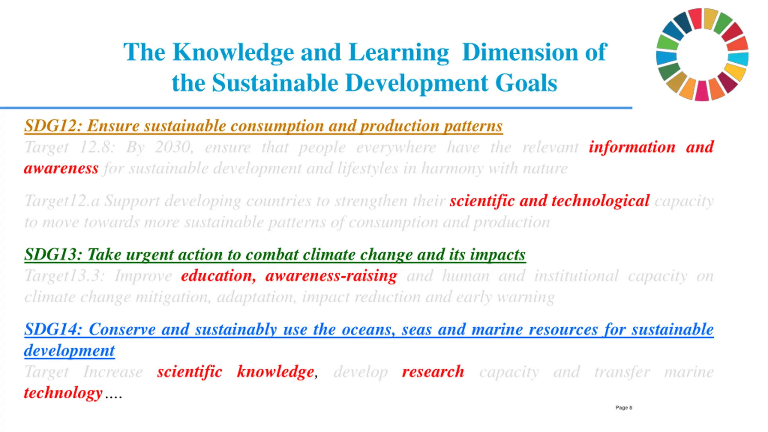 The Knowledge and Learning Dimension of the Sustainable Development Goals SDG12: Ensure sustainable consumption and production patterns Target 12.8: By 2030, ensure that people everywhere have the relevant information and awareness for sustainable development and lifestyles in harmony with nature Target12.a Support developing countries to strengthen their scientific and technological capacity to move towards more sustainable patterns of consumption and production SDG13: Take urgent action to combat climate change and its impacts Target13.3: Improve education, awareness-raising and human and institutional capacity on climate change mitigation, adaptation, impact reduction and early warning SDG14: Conserve and sustainably use the oceans, seas and marine resources for sustainable development Target Increase scientific knowledge, develop research capacity and transfer marine technology . Page 8
