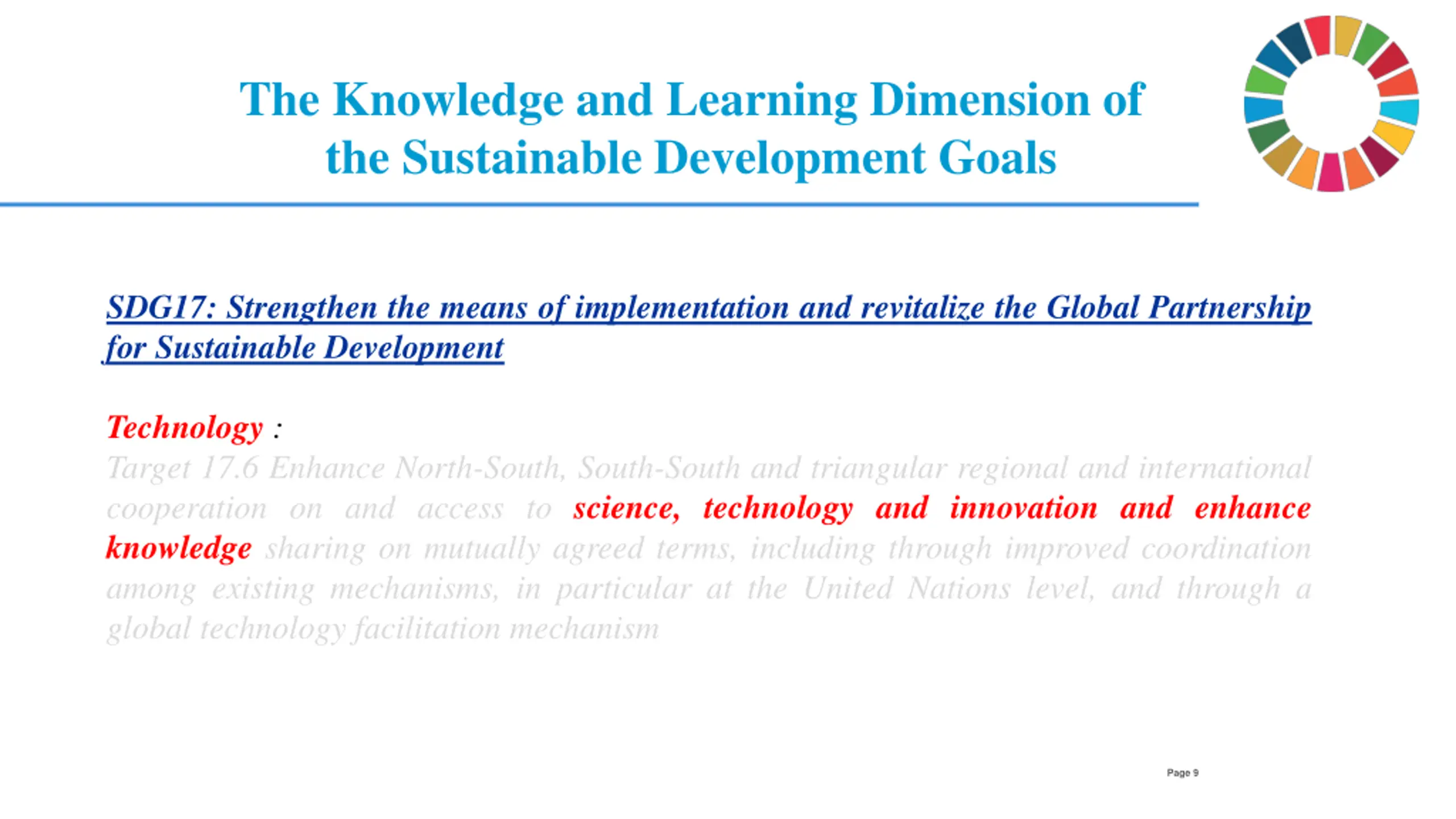 The Knowledge and Learning Dimension of the Sustainable Development Goals SDG17: Strengthen the means of implementation and revitalize the Global Partnership for Sustainable Development Technology : Target 17.6 Enhance North-South, South-South and triangular regional and international cooperation on and access to science, technology and innovation and enhance knowledge sharing on mutually agreed terms, including through improved coordination among existing mechanisms, in particular at the United Nations level, and through a global technology facilitation mechanism Page 9