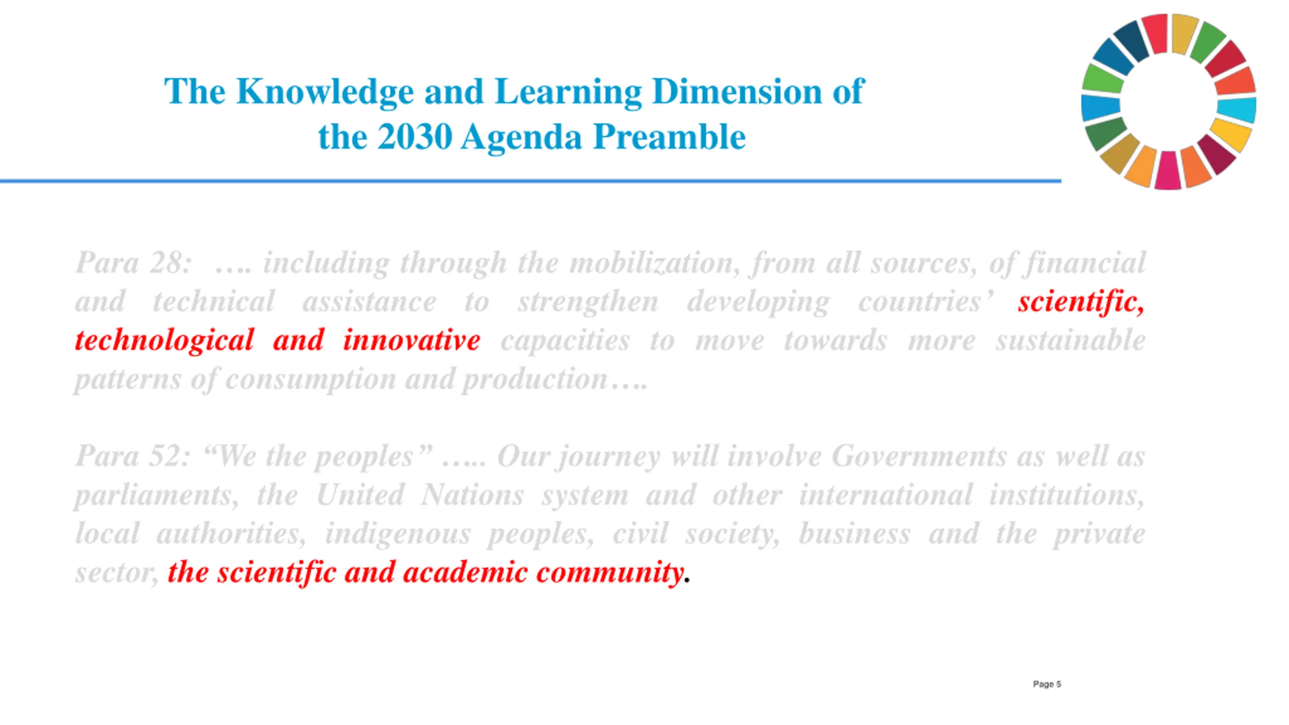 The Knowledge and Learning Dimension of the 2030 Agenda Preamble Para 28: . including through the mobilization, from all sources, of financial and technical assistance to strengthen developing countries scientific, technological and innovative capacities to move towards more sustainable patterns of consumption and production . Para 52: We the peoples .. Our journey will involve Governments as well as parliaments, the United Nations system and other international institutions, local authorities, indigenous peoples, civil society, business and the private sector, the scientific and academic community. Page 5