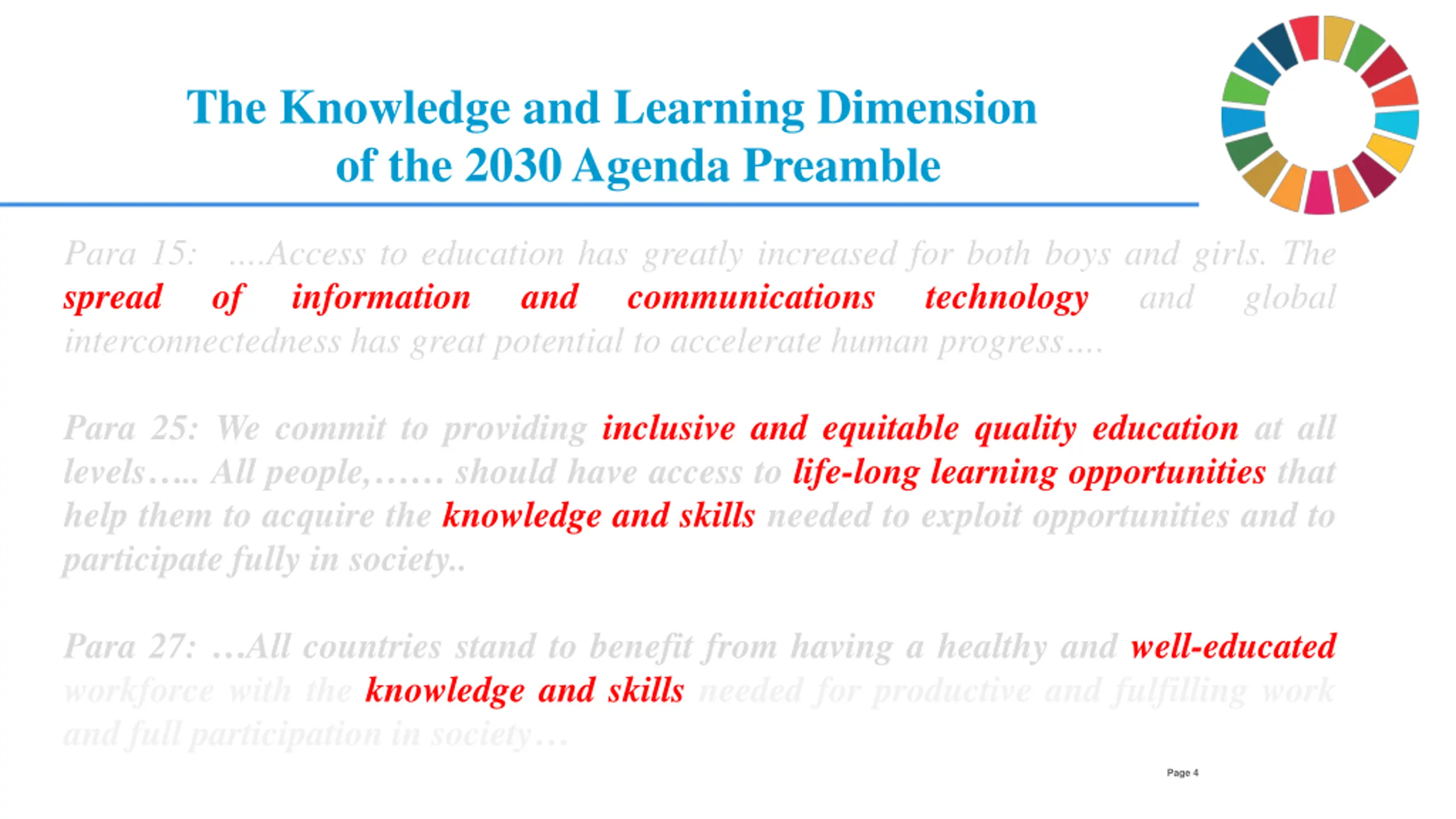 The Knowledge and Learning Dimension of the 2030 Agenda Preamble Para 15: .Access to education has greatly increased for both boys and girls. The spread of information and communications interconnectedness has great potential to accelerate human progress . technology and global Para 25: We commit to providing inclusive and equitable quality education at all levels .. All people, should have access to life-long learning opportunities that help them to acquire the knowledge and skills needed to exploit opportunities and to participate fully in society.. Para 27: All countries stand to benefit from having a healthy and well-educated workforce with the knowledge and skills needed for productive and fulfilling work and full participation in society Page 4