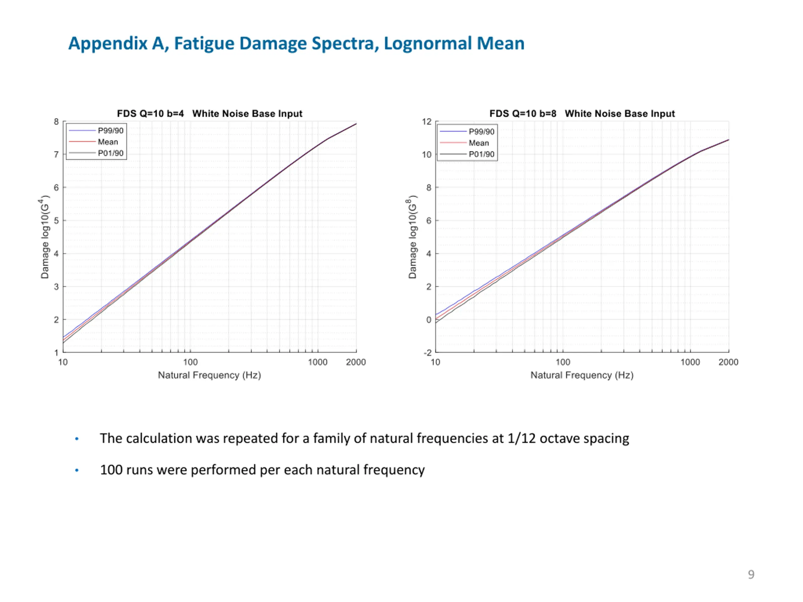 Appendix A, Fatigue Damage Spectra, Lognormal Mean The calculation was repeated for a family of natural frequencies at 1/12 octave spacing 100 runs were performed per each natural frequency 9