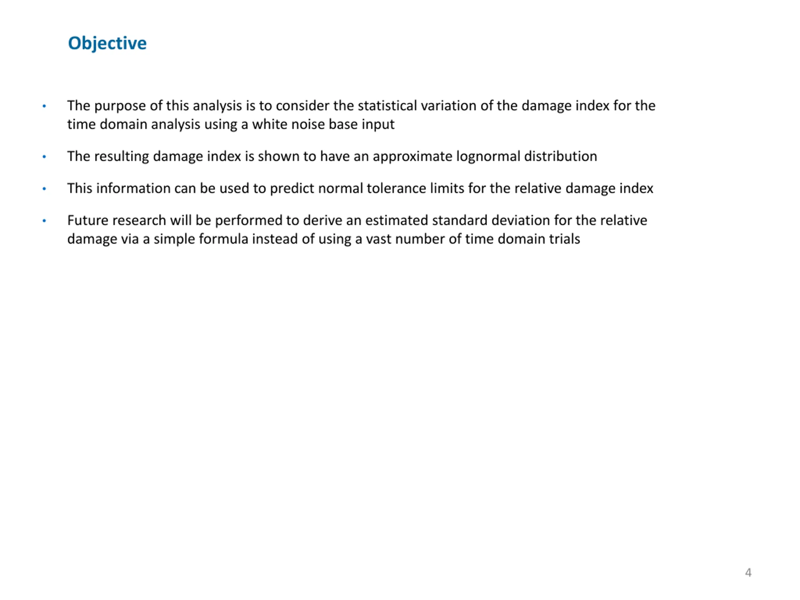 Objective The purpose of this analysis is to consider the statistical variation of the damage index for the time domain analysis using a white noise base input The resulting damage index is shown to have an approximate lognormal distribution This information can be used to predict normal tolerance limits for the relative damage index Future research will be performed to derive an estimated standard deviation for the relative damage via a simple formula instead of using a vast number of time domain trials 4