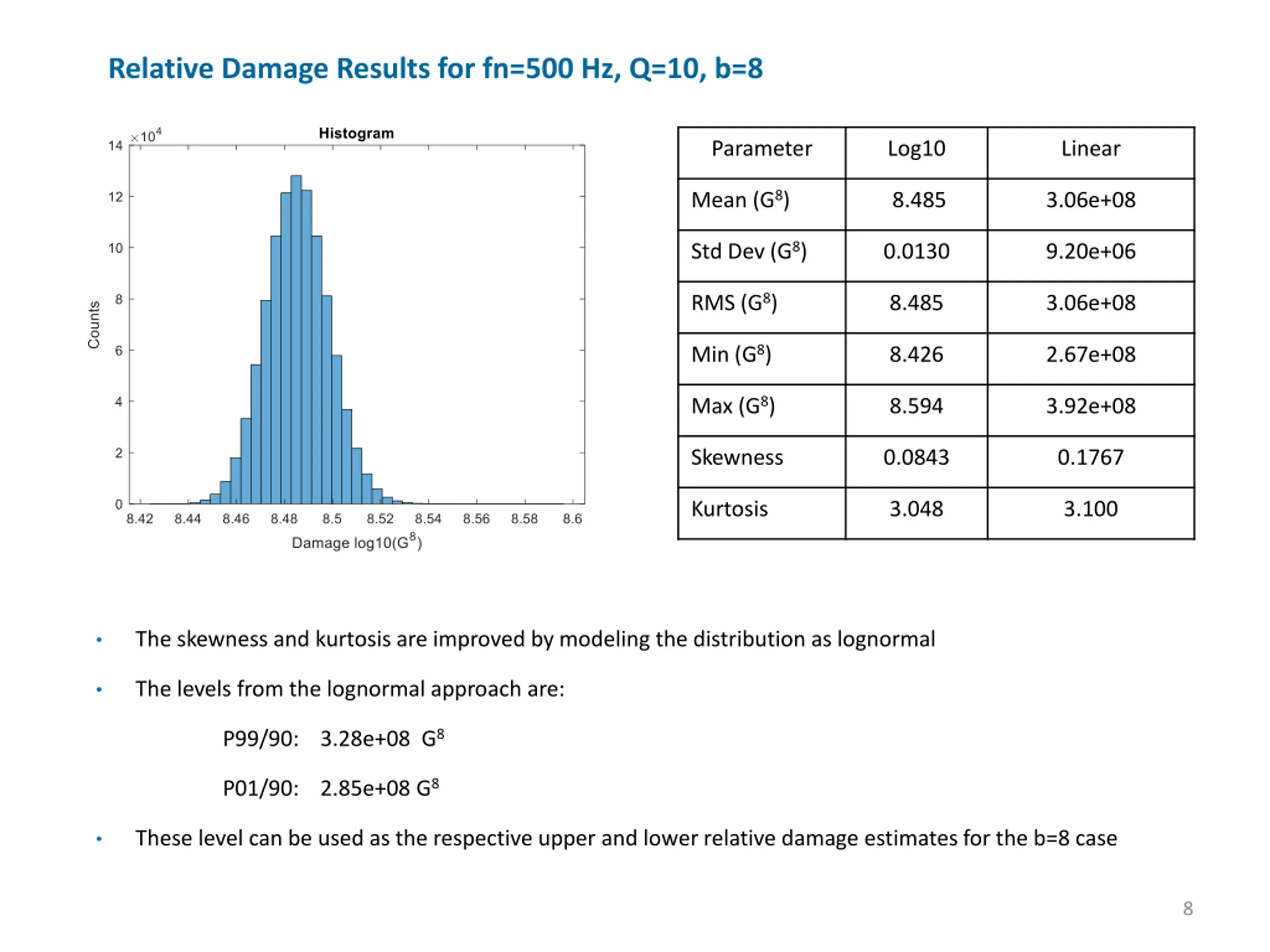 Relative Damage Results for fn=500 Hz, Q=10, b=4 Parameter Log10 Linear Mean (G4) 6.44 2.76e+06 Std Dev (G4) 0.004348 2.76e+04 RMS (G4) 6.44 2.76e+06 Min (G4) 6.420 2.63e+06 Max (G4) 6.462 2.90e+06 Skewness 0.00240 0.0324 Kurtosis 2.997 2.998 The skewness is improved by modeling the distribution as lognormal The levels from the lognormal approach are: P99/90: 2.82e+06 G4 P01/90: 2.69e+06 G4 These level can be used as the respective upper and lower relative damage estimates for the b=4 case 7