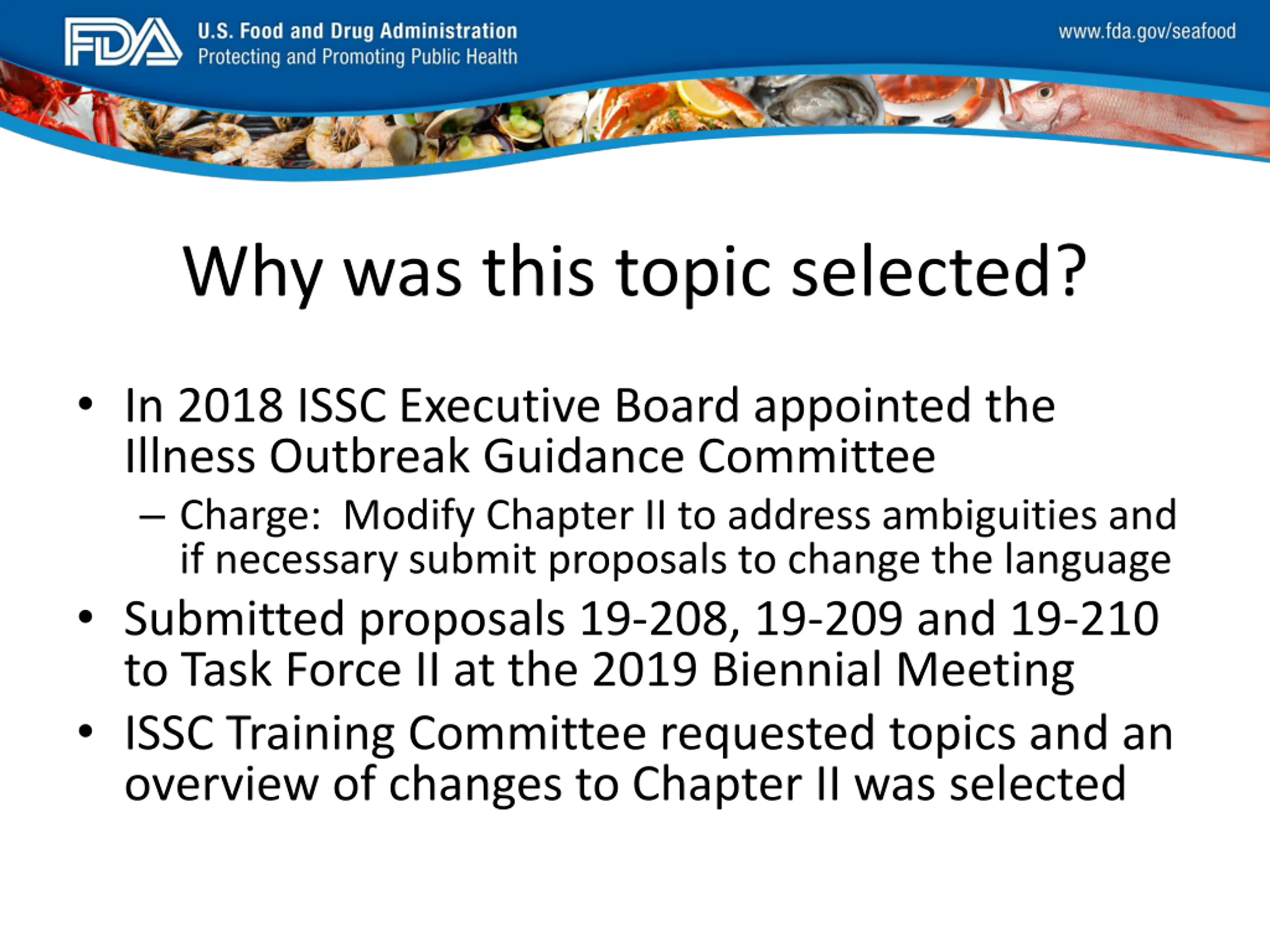 FDA_Swish_SeafoodXXX.png Why was this topic selected? In 2018 ISSC Executive Board appointed the Illness Outbreak Guidance Committee Charge: Modify Chapter II to address ambiguities and if necessary submit proposals to change the language Submitted proposals 19-208, 19-209 and 19-210 to Task Force II at the 2019 Biennial Meeting ISSC Training Committee requested topics and an overview of changes to Chapter II was selected