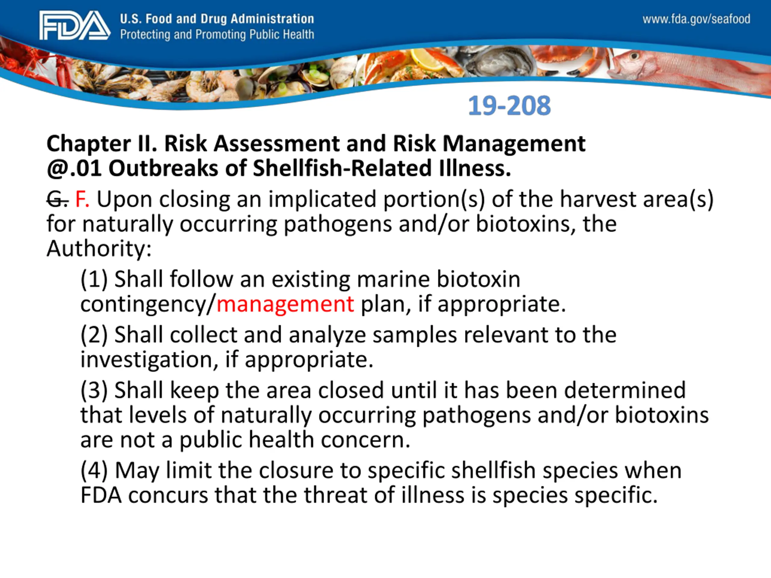 FDA_Swish_SeafoodXXX.png Chapter II. Risk Assessment and Risk Management @.01 Outbreaks of Shellfish-Related Illness. G. F. Upon closing an implicated portion(s) of the harvest area(s) for naturally occurring pathogens and/or biotoxins, the Authority: (1) Shall follow an existing marine biotoxin contingency/management plan, if appropriate. (2) Shall collect and analyze samples relevant to the investigation, if appropriate. (3) Shall keep the area closed until it has been determined that levels of naturally occurring pathogens and/or biotoxins are not a public health concern. (4) May limit the closure to specific shellfish species when FDA concurs that the threat of illness is species specific.