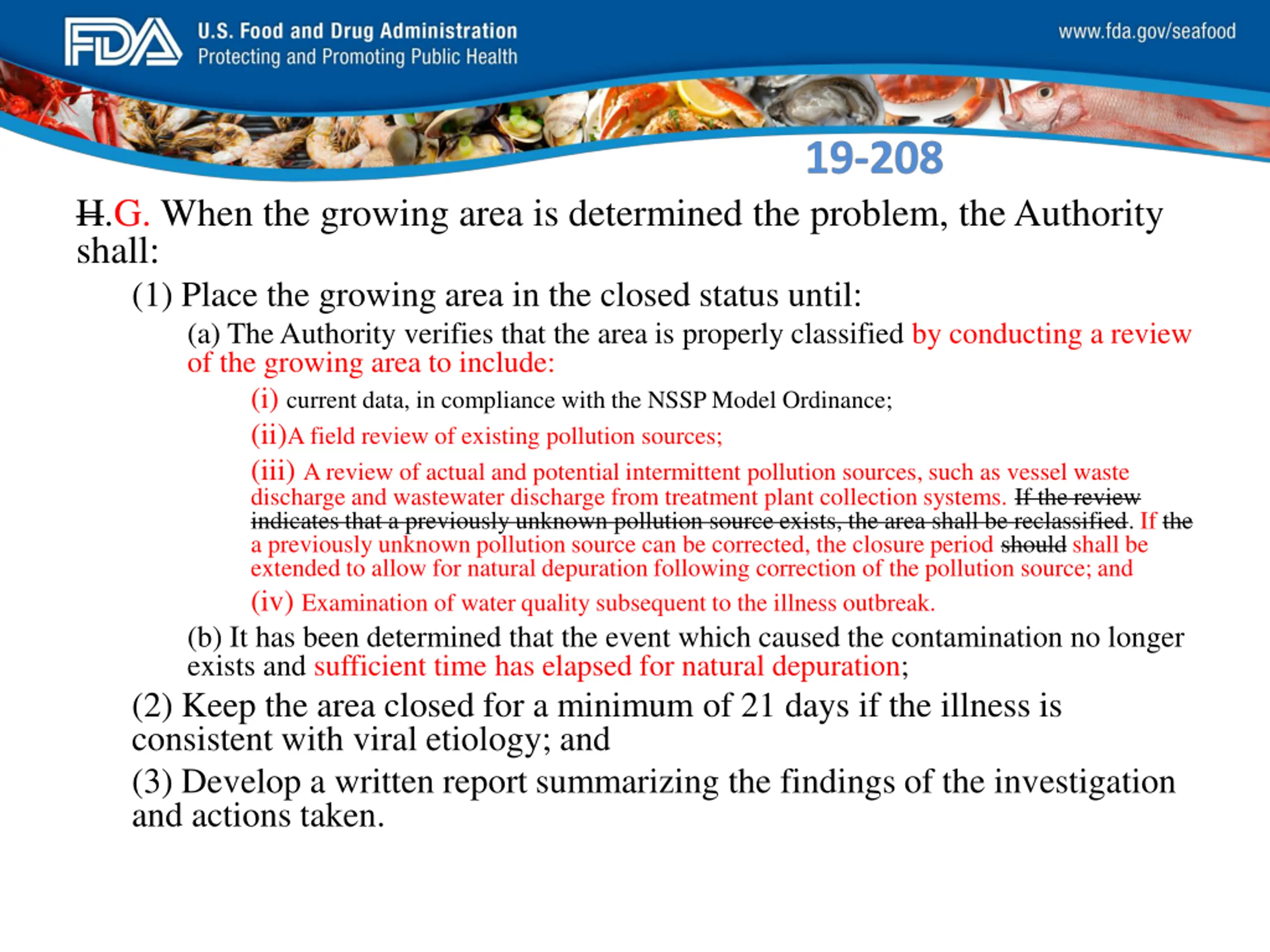 FDA_Swish_SeafoodXXX.png H.G. When the growing area is determined the problem, the Authority shall: (1) Place the growing area in the closed status until: (a) The Authority verifies that the area is properly classified by conducting a review of the growing area to include: (i) current data, in compliance with the NSSP Model Ordinance; (ii)A field review of existing pollution sources; (iii) A review of actual and potential intermittent pollution sources, such as vessel waste discharge and wastewater discharge from treatment plant collection systems. If the review indicates that a previously unknown pollution source exists, the area shall be reclassified. If the a previously unknown pollution source can be corrected, the closure period should shall be extended to allow for natural depuration following correction of the pollution source; and (iv) Examination of water quality subsequent to the illness outbreak. (b) It has been determined that the event which caused the contamination no longer exists and sufficient time has elapsed for natural depuration; (2) Keep the area closed for a minimum of 21 days if the illness is consistent with viral etiology; and (3) Develop a written report summarizing the findings of the investigation and actions taken.