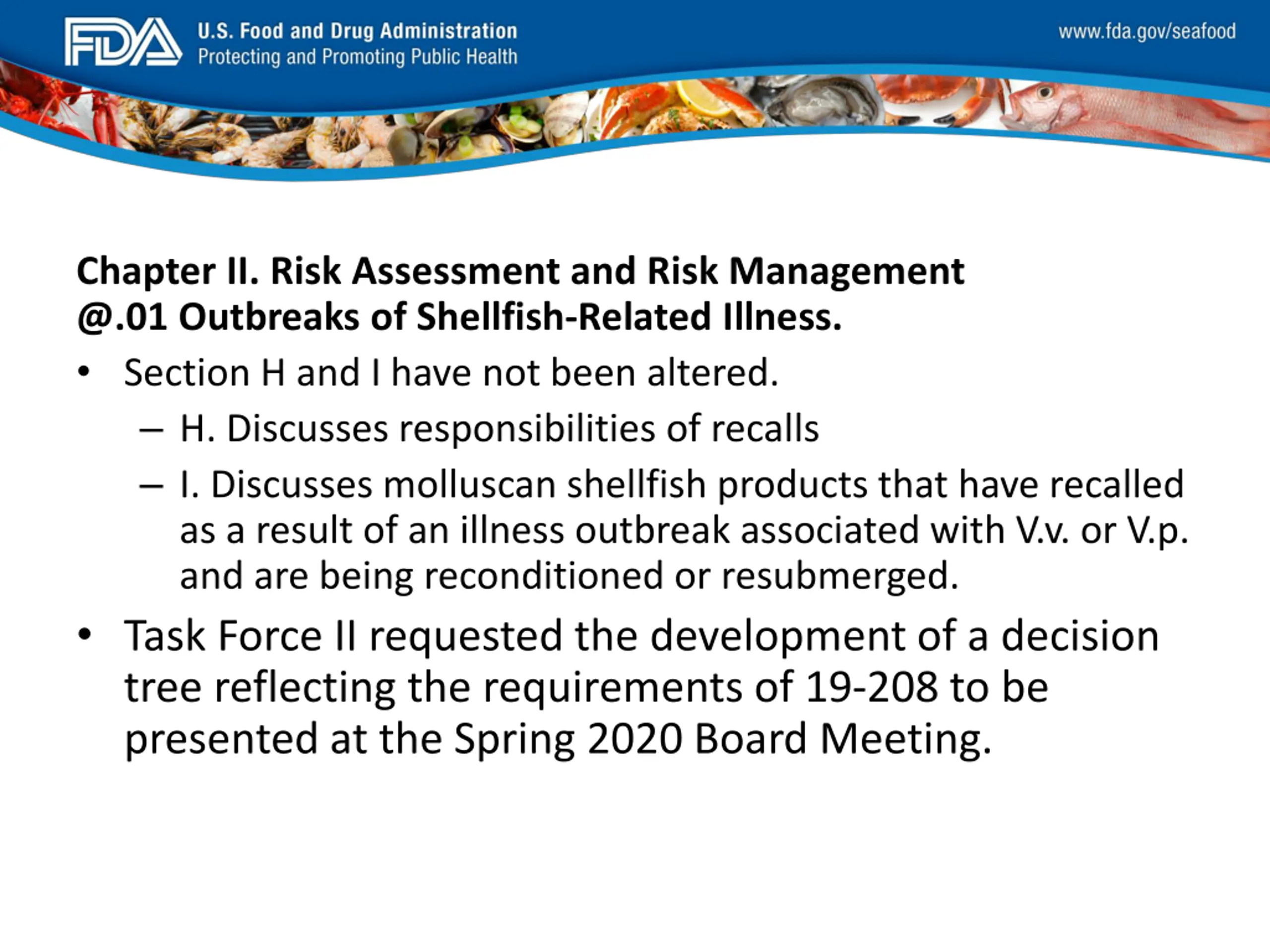 FDA_Swish_SeafoodXXX.png Chapter II. Risk Assessment and Risk Management @.01 Outbreaks of Shellfish-Related Illness. Section H and I have not been altered. H. Discusses responsibilities of recalls I. Discusses molluscan shellfish products that have recalled as a result of an illness outbreak associated with V.v. or V.p. and are being reconditioned or resubmerged. Task Force II requested the development of a decision tree reflecting the requirements of 19-208 to be presented at the Spring 2020 Board Meeting.