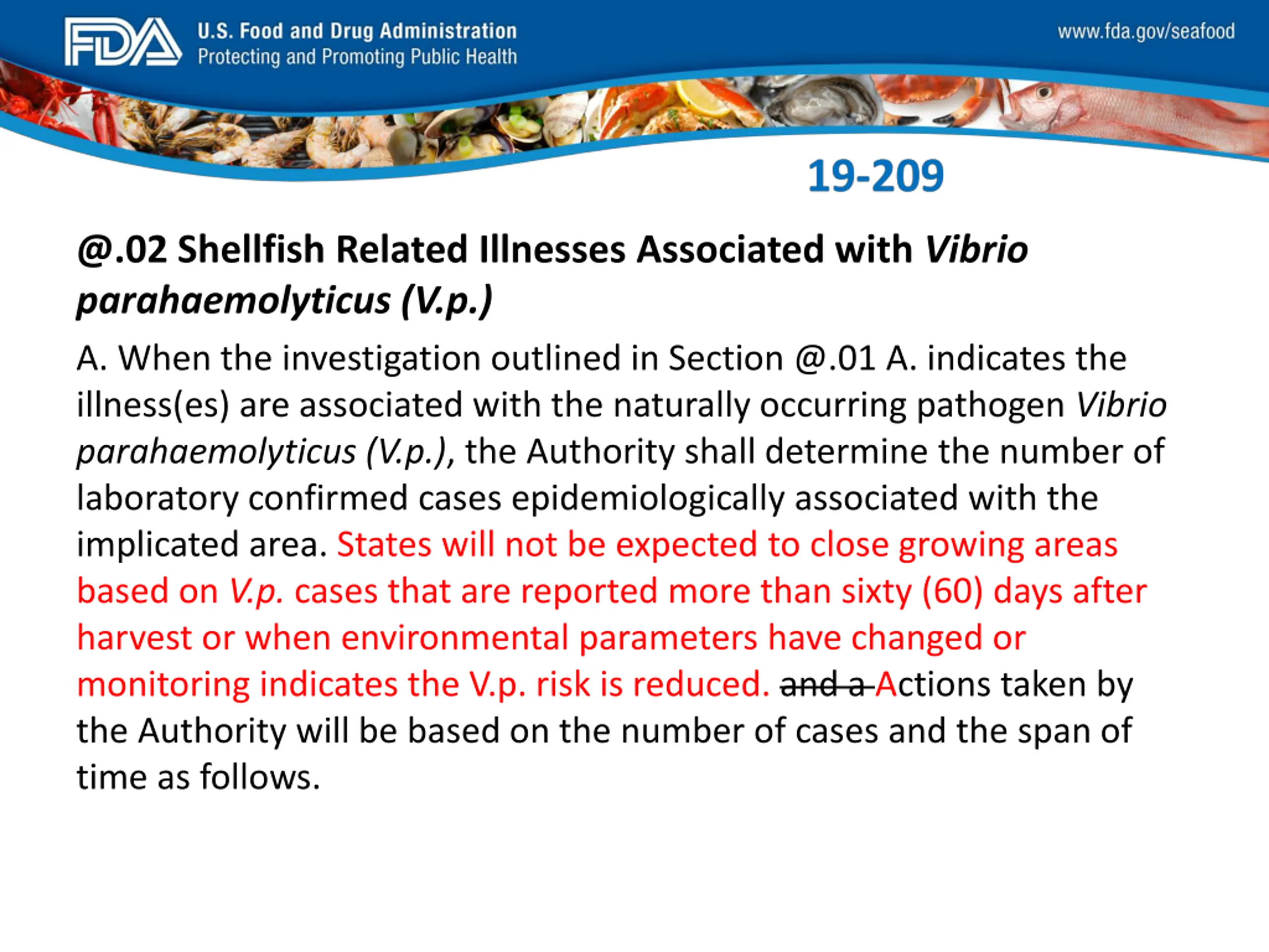 FDA_Swish_SeafoodXXX.png @.02 Shellfish Related Illnesses Associated with Vibrio parahaemolyticus (V.p.) A. When the investigation outlined in Section @.01 A. indicates the illness(es) are associated with the naturally occurring pathogen Vibrio parahaemolyticus (V.p.), the Authority shall determine the number of laboratory confirmed cases epidemiologically associated with the implicated area. States will not be expected to close growing areas based on V.p. cases that are reported more than sixty (60) days after harvest or when environmental parameters have changed or monitoring indicates the V.p. risk is reduced. and a Actions taken by the Authority will be based on the number of cases and the span of time as follows.