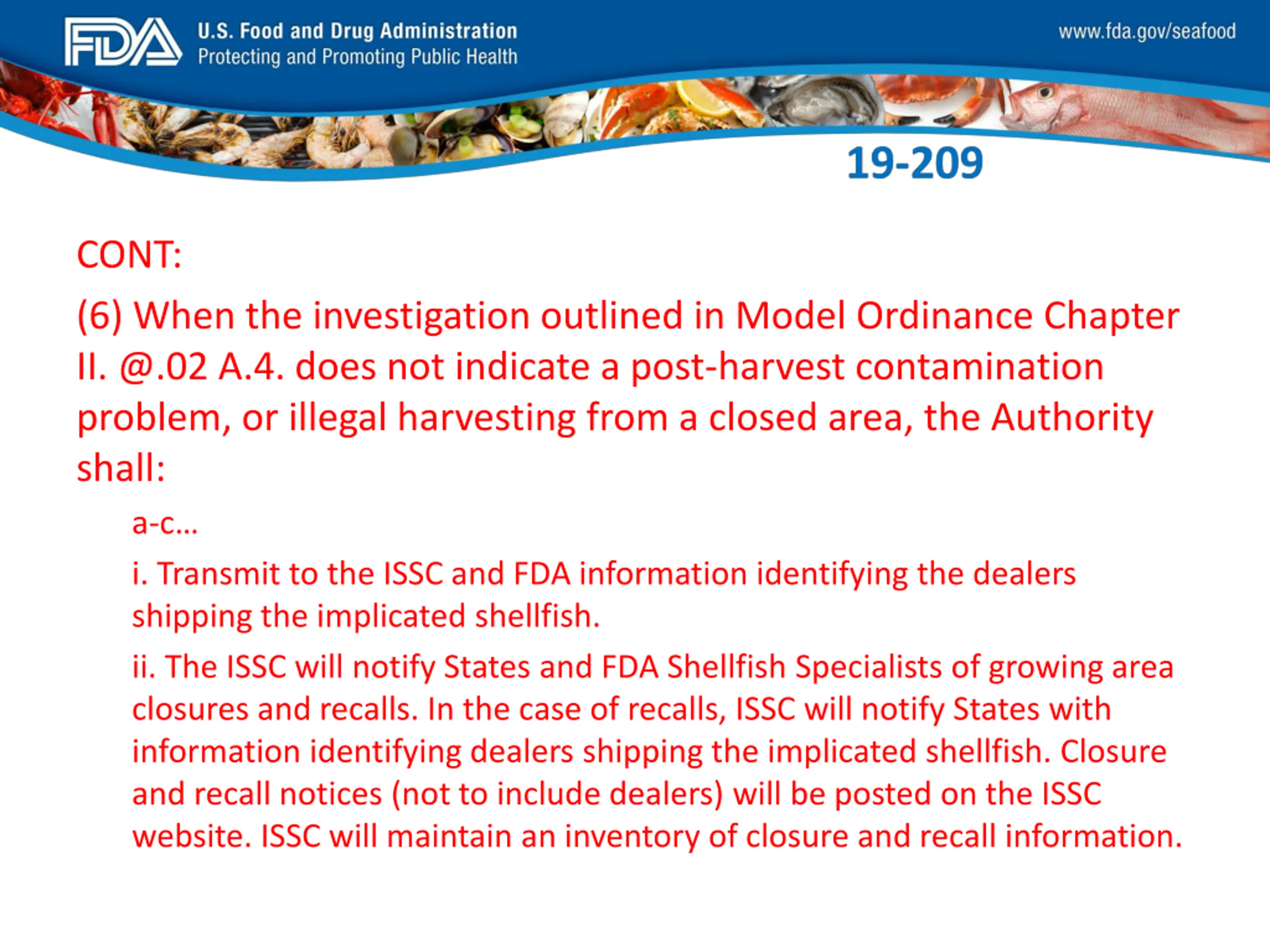 FDA_Swish_SeafoodXXX.png CONT: (6) When the investigation outlined in Model Ordinance Chapter II. @.02 A.4. does not indicate a post-harvest contamination problem, or illegal harvesting from a closed area, the Authority shall: a-c i. Transmit to the ISSC and FDA information identifying the dealers shipping the implicated shellfish. ii. The ISSC will notify States and FDA Shellfish Specialists of growing area closures and recalls. In the case of recalls, ISSC will notify States with information identifying dealers shipping the implicated shellfish. Closure and recall notices (not to include dealers) will be posted on the ISSC website. ISSC will maintain an inventory of closure and recall information.