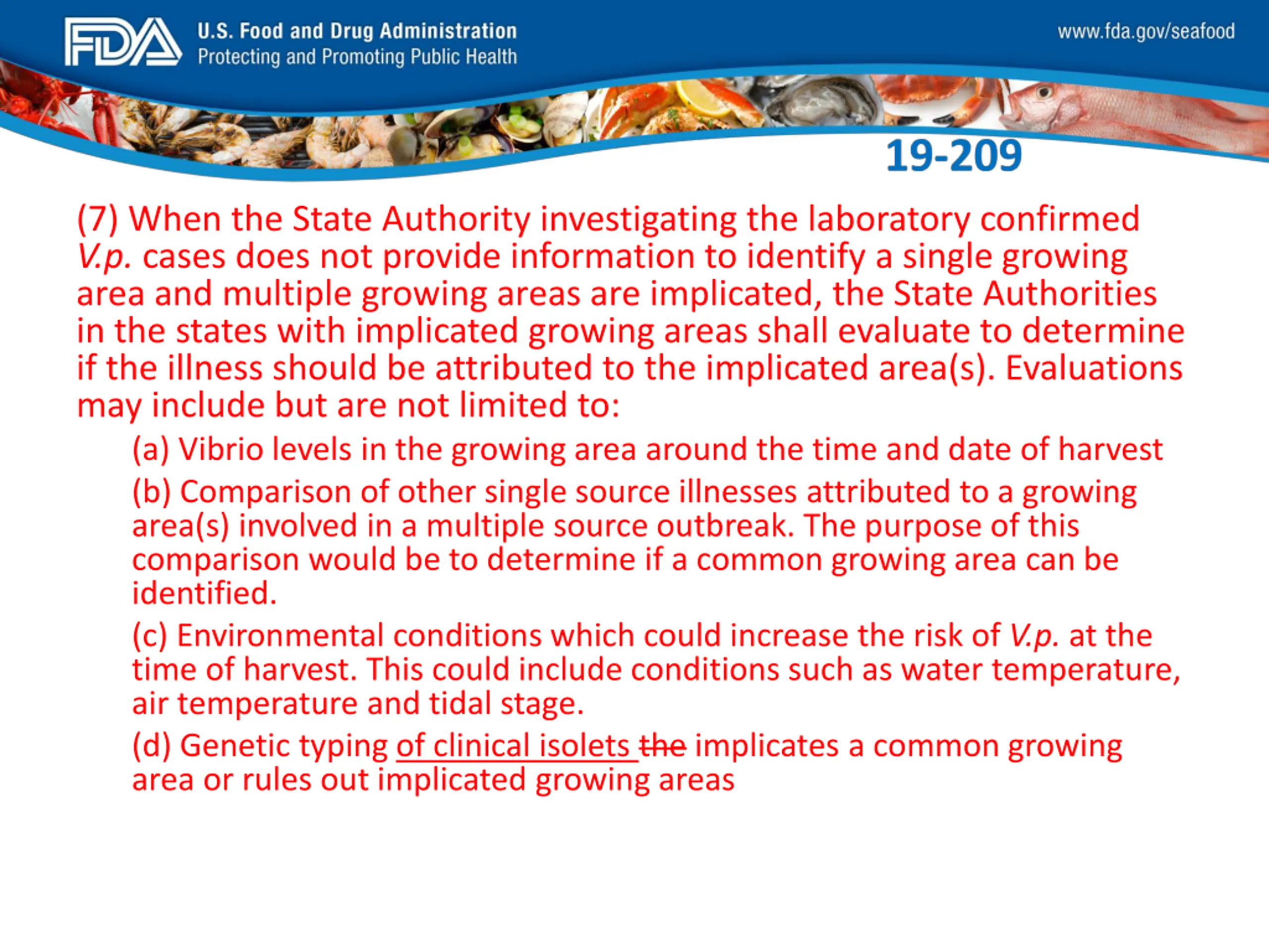 FDA_Swish_SeafoodXXX.png (7) When the State Authority investigating the laboratory confirmed V.p. cases does not provide information to identify a single growing area and multiple growing areas are implicated, the State Authorities in the states with implicated growing areas shall evaluate to determine if the illness should be attributed to the implicated area(s). Evaluations may include but are not limited to: (a) Vibrio levels in the growing area around the time and date of harvest (b) Comparison of other single source illnesses attributed to a growing area(s) involved in a multiple source outbreak. The purpose of this comparison would be to determine if a common growing area can be identified. (c) Environmental conditions which could increase the risk of V.p. at the time of harvest. This could include conditions such as water temperature, air temperature and tidal stage. (d) Genetic typing of clinical isolets the implicates a common growing area or rules out implicated growing areas