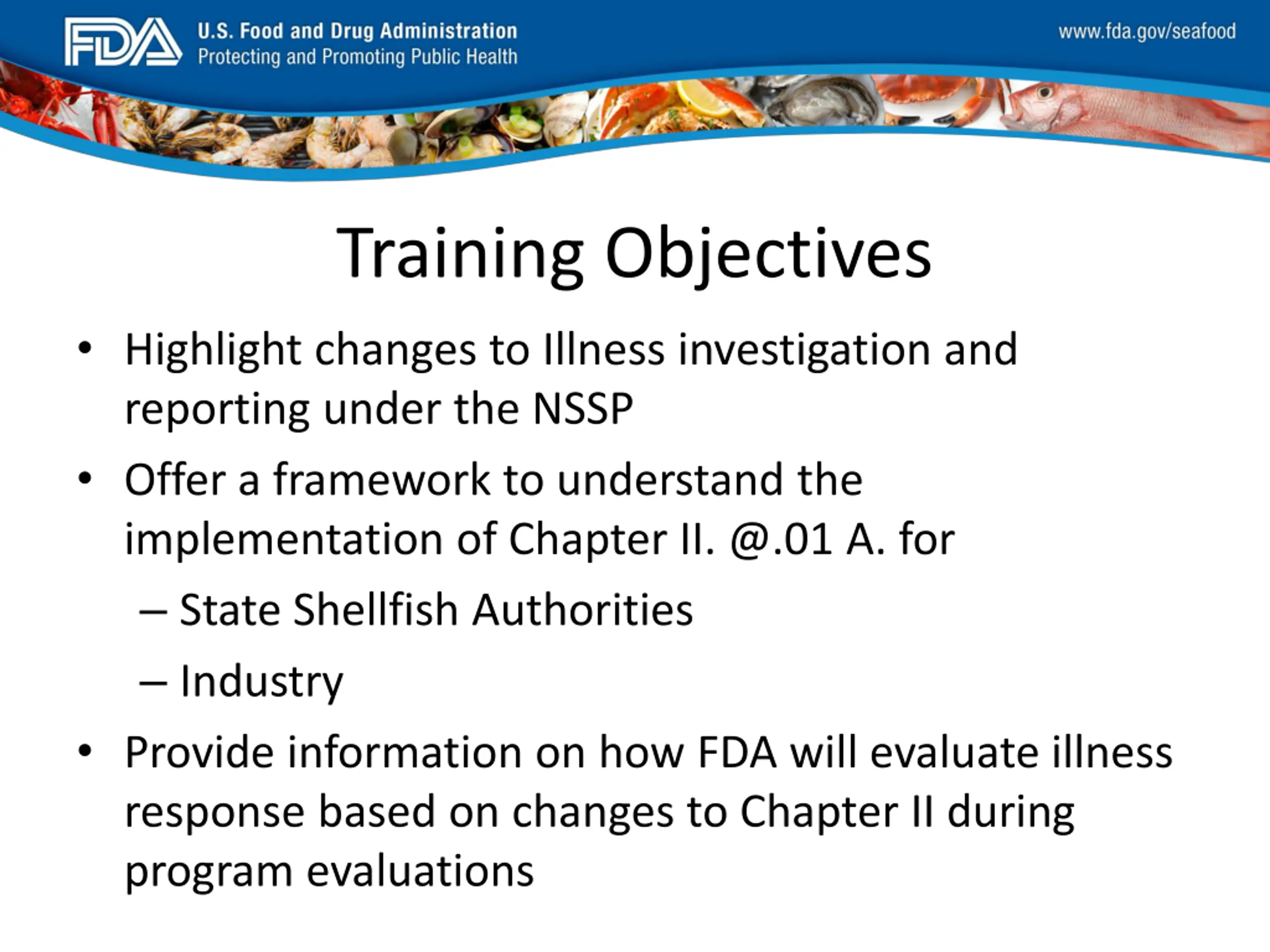 FDA_Swish_SeafoodXXX.png Training Objectives Highlight changes to Illness investigation and reporting under the NSSP Offer a framework to understand the implementation of Chapter II. @.01 A. for State Shellfish Authorities Industry Provide information on how FDA will evaluate illness response based on changes to Chapter II during program evaluations