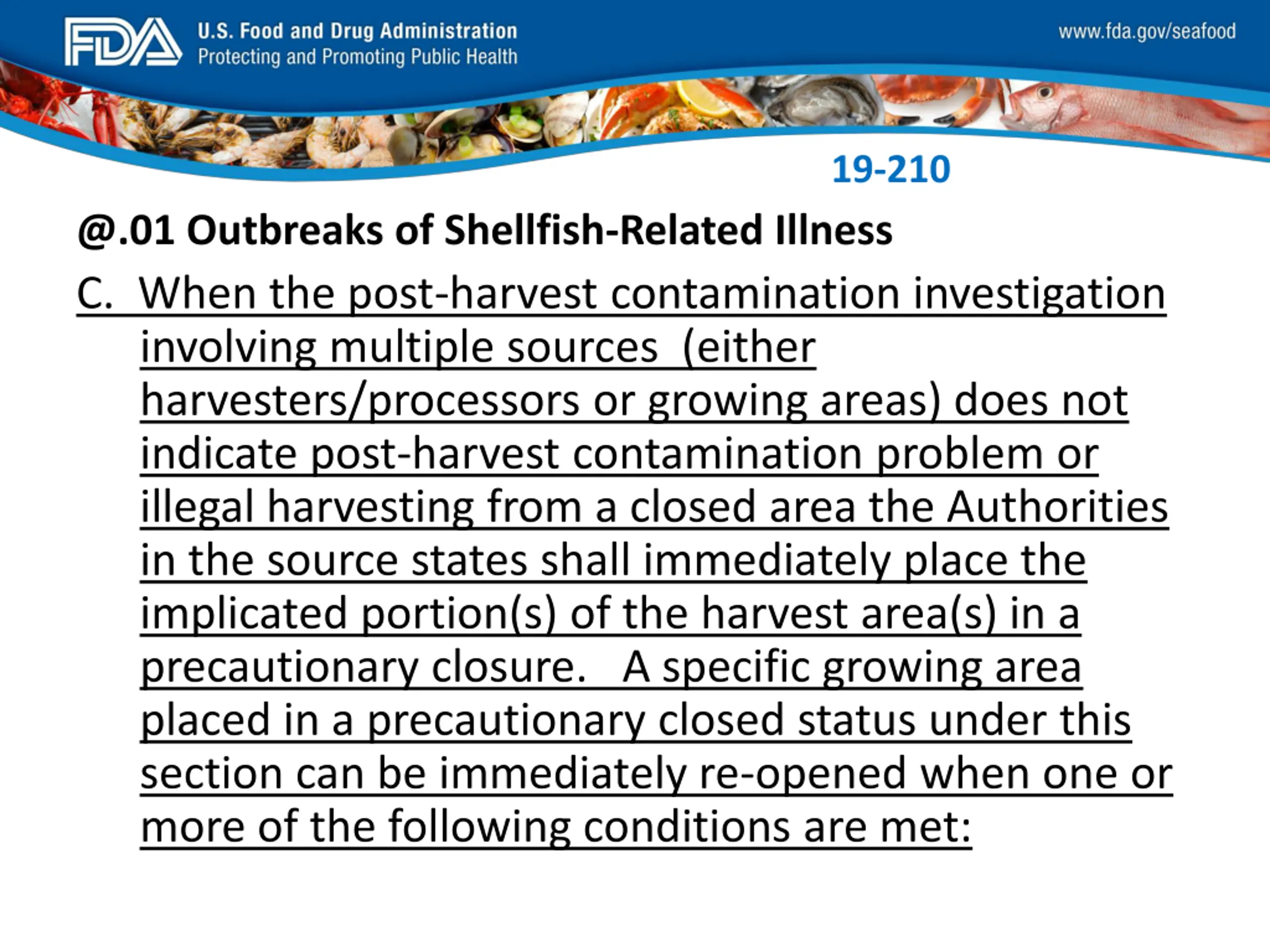 FDA_Swish_SeafoodXXX.png 19-210 @.01 Outbreaks of Shellfish-Related Illness C. When the post-harvest contamination investigation involving multiple sources (either harvesters/processors or growing areas) does not indicate post-harvest contamination problem or illegal harvesting from a closed area the Authorities in the source states shall immediately place the implicated portion(s) of the harvest area(s) in a precautionary closure. A specific growing area placed in a precautionary closed status under this section can be immediately re-opened when one or more of the following conditions are met: