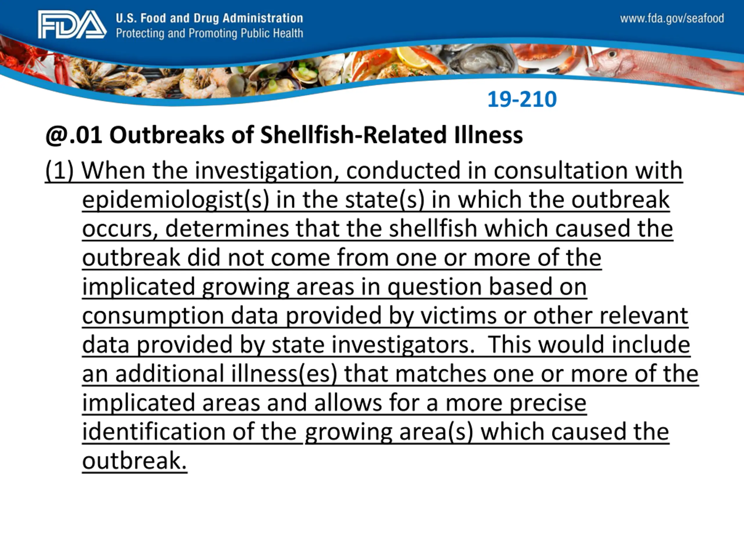 FDA_Swish_SeafoodXXX.png 19-210 @.01 Outbreaks of Shellfish-Related Illness (1) When the investigation, conducted in consultation with epidemiologist(s) in the state(s) in which the outbreak occurs, determines that the shellfish which caused the outbreak did not come from one or more of the implicated growing areas in question based on consumption data provided by victims or other relevant data provided by state investigators. This would include an additional illness(es) that matches one or more of the implicated areas and allows for a more precise identification of the growing area(s) which caused the outbreak.