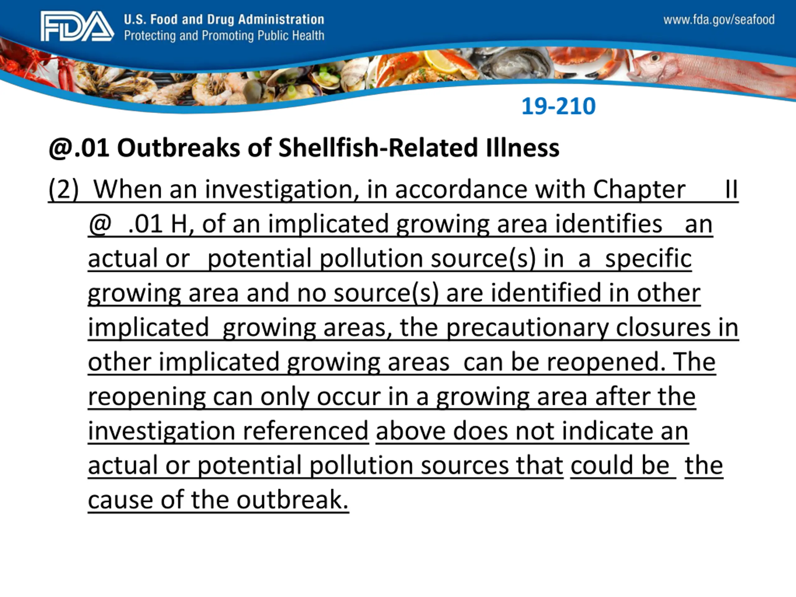 FDA_Swish_SeafoodXXX.png 19-210 @.01 Outbreaks of Shellfish-Related Illness (2) When an investigation, in accordance with Chapter @ .01 H, of an implicated growing area identifies an actual or potential pollution source(s) in a specific growing area and no source(s) are identified in other implicated growing areas, the precautionary closures in other implicated growing areas can be reopened. The reopening can only occur in a growing area after the investigation referenced above does not indicate an actual or potential pollution sources that could be the cause of the outbreak. II