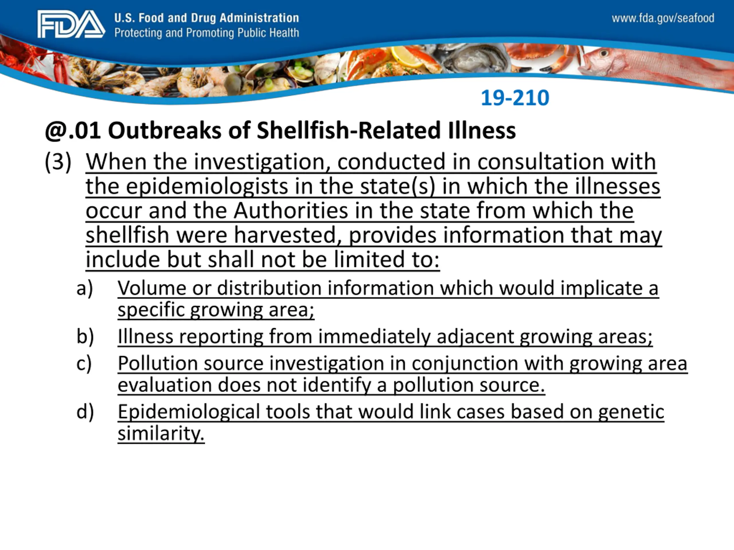 FDA_Swish_SeafoodXXX.png 19-210 @.01 Outbreaks of Shellfish-Related Illness (3) When the investigation, conducted in consultation with the epidemiologists in the state(s) in which the illnesses occur and the Authorities in the state from which the shellfish were harvested, provides information that may include but shall not be limited to: a) Volume or distribution information which would implicate a specific growing area; b) Illness reporting from immediately adjacent growing areas; c) Pollution source investigation in conjunction with growing area evaluation does not identify a pollution source. d) Epidemiological tools that would link cases based on genetic similarity.