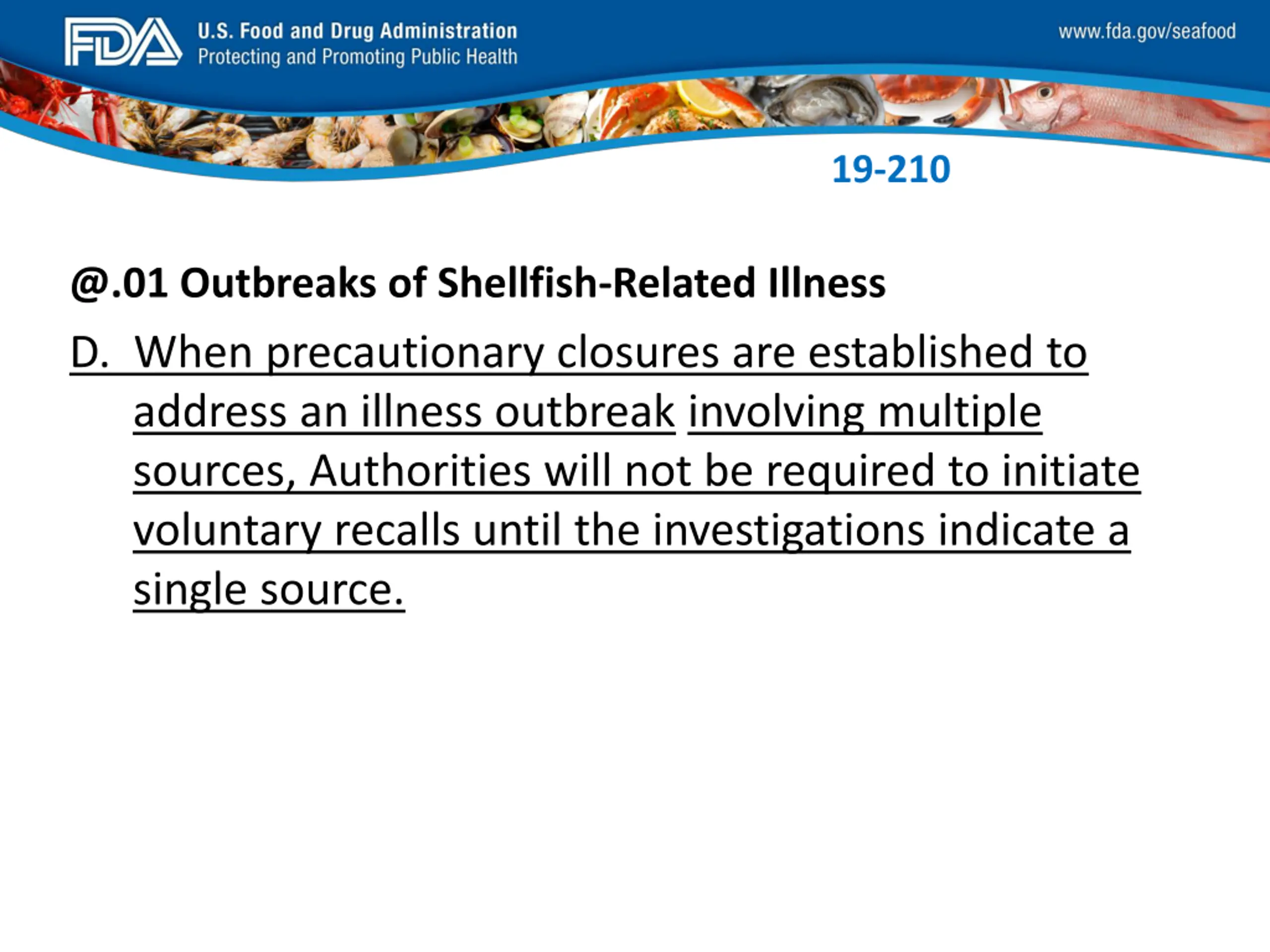 FDA_Swish_SeafoodXXX.png 19-210 @.01 Outbreaks of Shellfish-Related Illness D. When precautionary closures are established to address an illness outbreak involving multiple sources, Authorities will not be required to initiate voluntary recalls until the investigations indicate a single source.